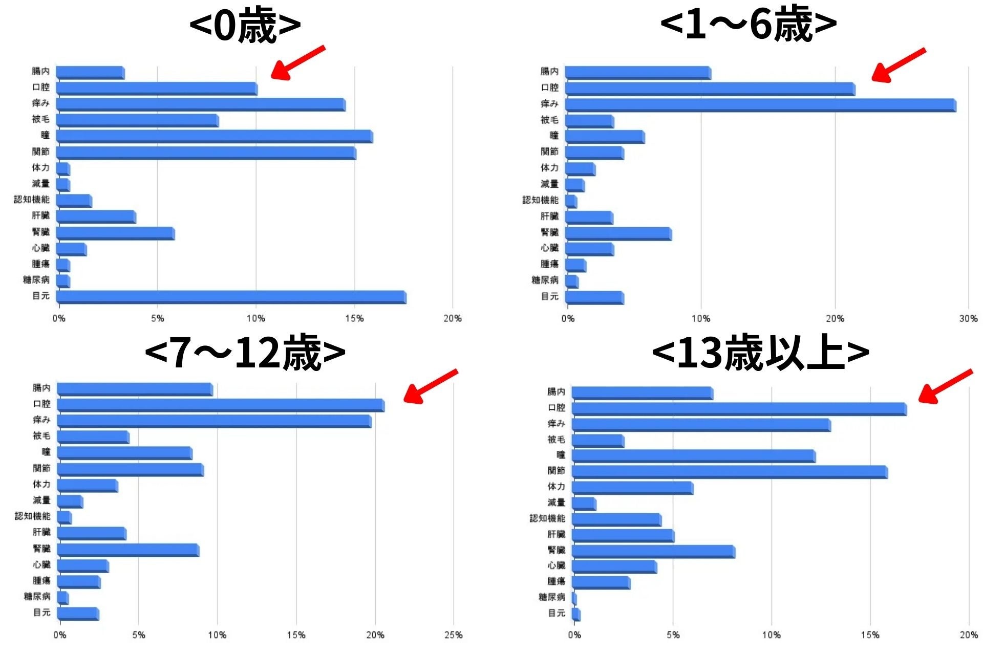 当社が実施した自社調査(※3/回答数4,450)でも、犬の年齢が上がるにつれて「口腔ケア」が飼い主の主な悩みとなる傾向が顕著に見られました(添付グラフ参照)。