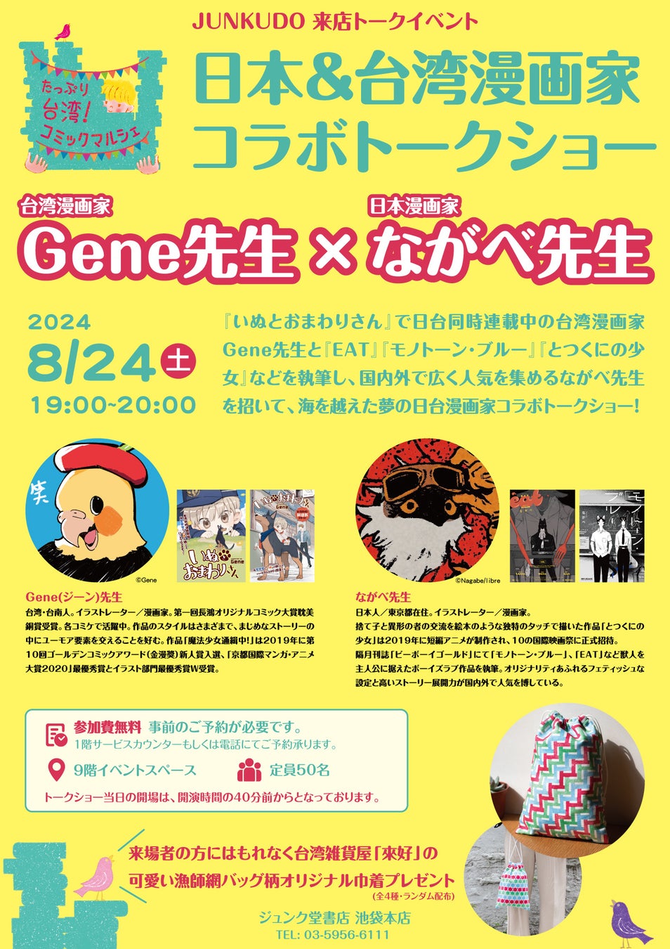 期間中には、台湾漫画家Gene(ジーン)先生が来日し、日本漫画家のながべ先生との海を越えた日台漫画家コラボトークショーの開催や、台湾雑貨がもらえるキャンペーン、台湾グルメの提供など、台湾を「たっぷり」と楽しんでいただける企画を多数ご用意しております。