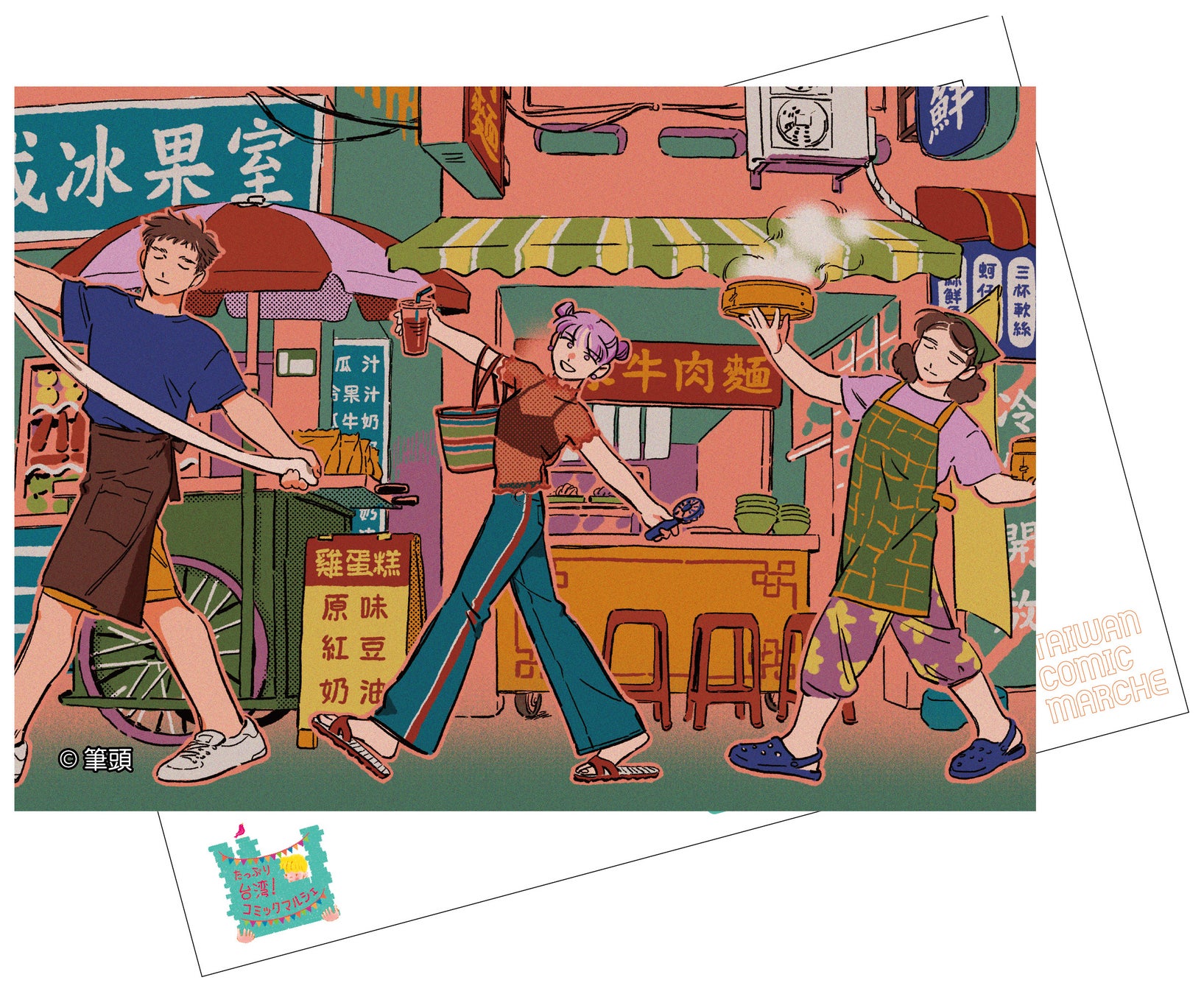 期間中に『たっぷり台湾!コミックマルシェ』コーナーにて、日本語翻訳版の台湾漫画を購入された方には、もれなく、3名の漫画家が描き下ろしたイラストのポストカード(1書店1名の先生のポストカード)をプレゼント。あわせて、対象商品を税込3,000円以上購入された方には、先着順で、台湾雑貨屋『來好』の小籠包やパイナップルなど台湾を代表するグルメをモチーフにした可愛いピンバッジをプレゼント。