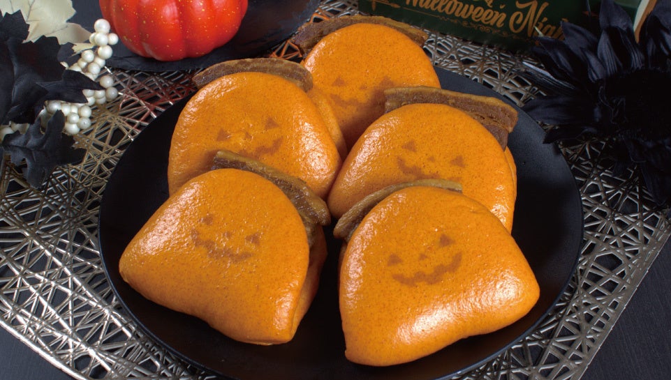 見た目でも楽しめるよう、商品にはジャック・オー・ランタンの印が施されています。定番タイプと唐辛子パウダーを練りこんだピリ辛タイプの2種類の生地でご用意しました。