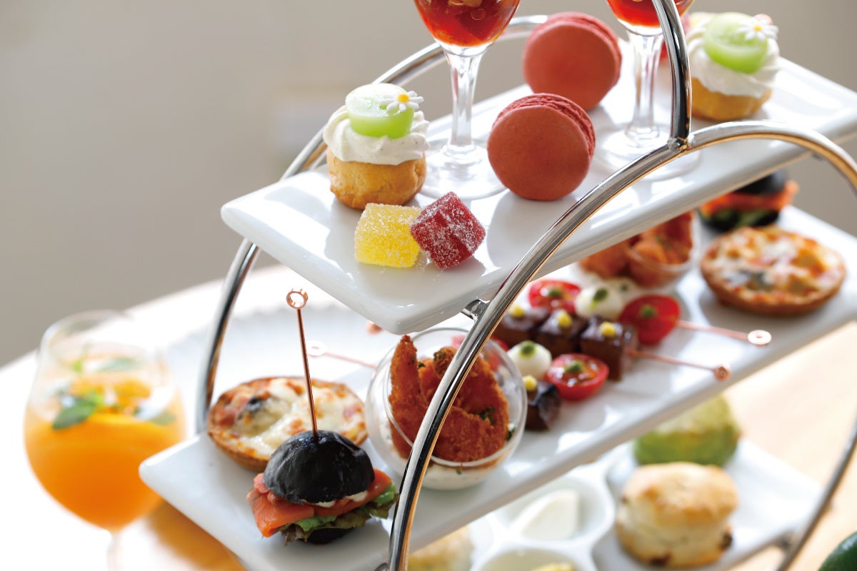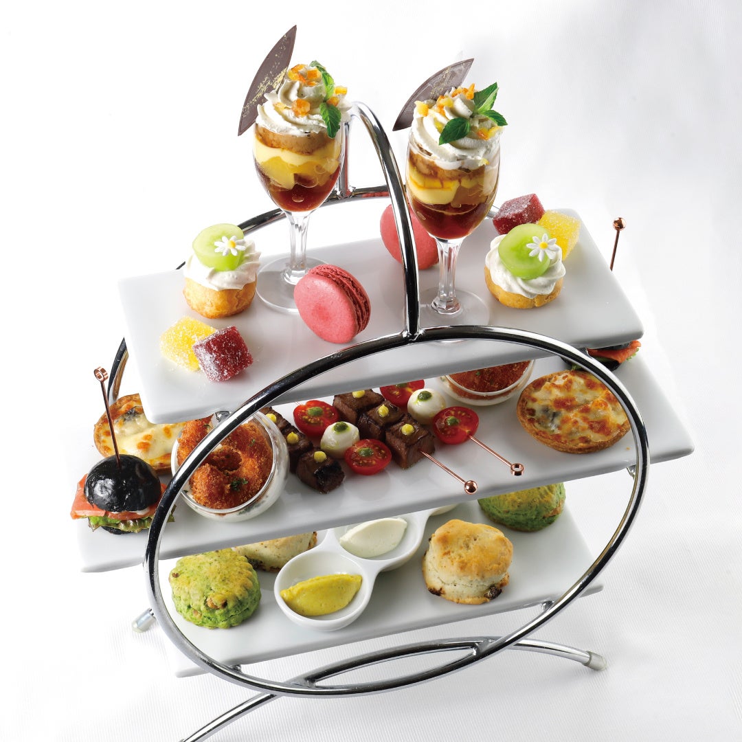 【内 容】スモークサーモンの竹炭バーガー、シュリンプフライ、ピンチョス(ローストビーフ・カプレーゼ)、チキンとマッシュルームのグラタン、スコーン2種(ほうれん草・ドライトマト)と3種のディップ添え(タプナード・クロテッドクリーム・カレーポテト)、紅茶のミニパフェ、パート・ド・フリュイ2種、季節フルーツのシュー、マカロン、お好きなお飲み物 ※17時からのご提供となります。