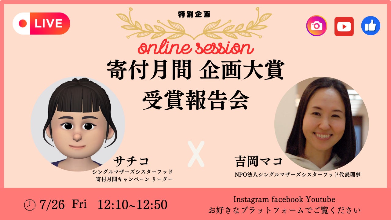 2024年4月に寄付月間推進委員会により発表された「寄付月間企画大賞」を受賞したNPO法人シングルマザーズシスターフッドが、2024年7月26日(金)12:10PMより、オンライン報告会を開催します。