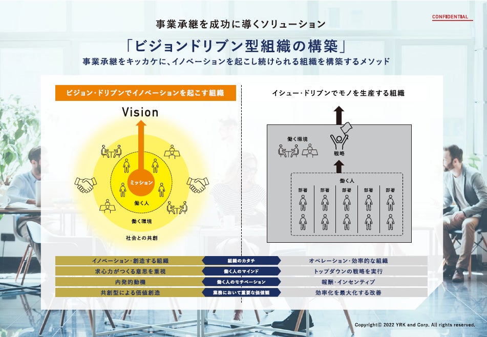 事業承継をキッカケに、イノベーションを起こし続けられる組織へ生まれ変わるためには、イシュー・ドリブンでモノを生産する組織ではなく、ビジョン・ドリブン型の組織構築が必要です。そのためにYRK&では独自のCX(コーポレートトランスフォーメーション)プロジェクトスキームで企業の体質から改善いたします。