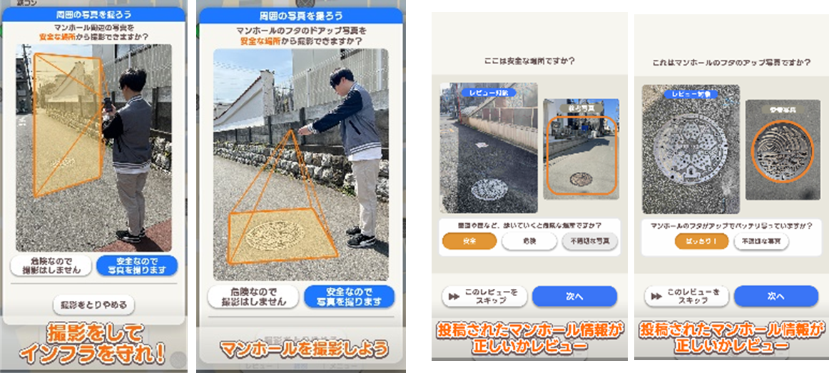 3)「鉄とコンクリートの守り人」アプリを使って、マンホールを撮影・投稿。もしくは「鉄とコンクリートの守り人」アプリを使って、投稿されている画像をレビュー。