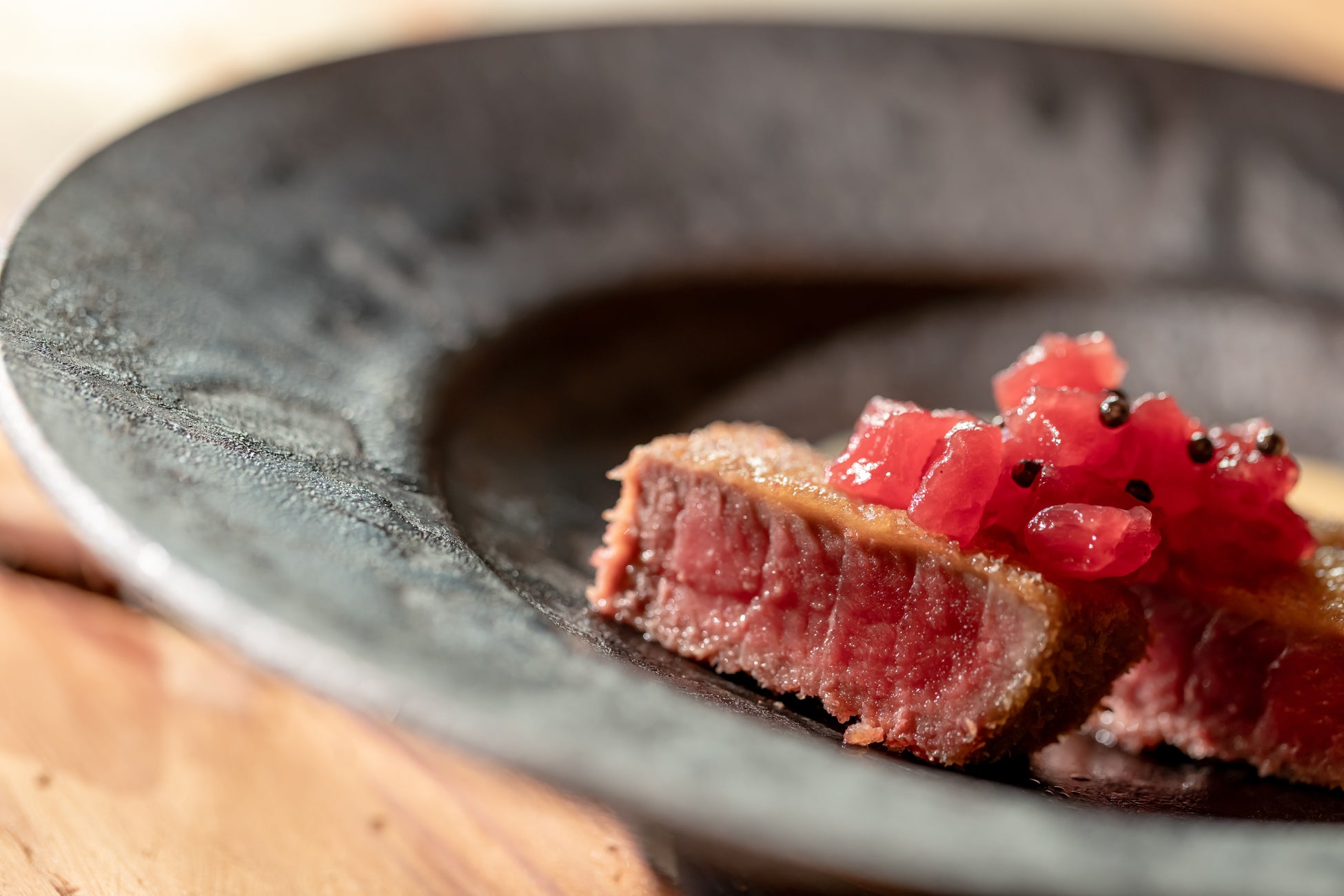 満を持して登場するのが、鹿児島県「浅沼畜産」が監修肥育し、厳選したハイブリッドビーフ。神田氏も開発に携わり、和牛と乳用牛と掛け合わせることで、サシが入り過ぎず、赤身の食感を味わえるのが特徴。