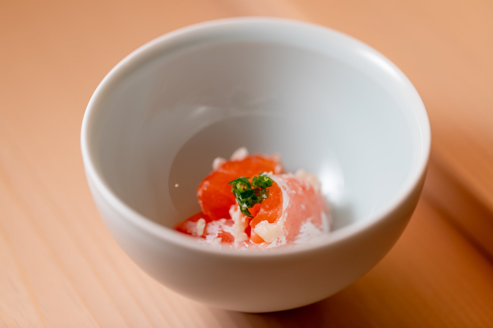 富士山の湧水で育った紅富士鱒を3日間熟成し、昆布締めへと昇華した地の魚のつまみほか、黄身酢おぼろをまとった春子鯛、その見た目から命名された、マグロの中落ちにネギとたくあんが入ったおはぎなど、「すし匠」の名品も健在。澄んだ空気のなかで湯に浸かったあと、丁寧な手仕事が施された世界最高峰の鮨を、ただリラックスして味わう。地球上のどこにもないオアシスのような鮨屋、それが「富士 匠」なのです。