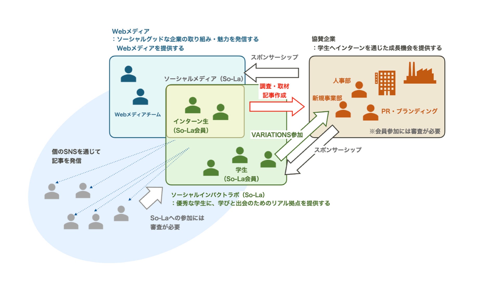 また、本取り組みへの関わり方の1つとして企業スポンサードを設けております。オープンイノベーションプログラム「VARIATIONS」(バリエーションズ)や学生メディアといった、学生と企業の共創プログラムを通じて学生へ成長機会を提供いただくことで、学生の企業理解を深めるとともに多方面で活躍する学生との連携を図ることができます。