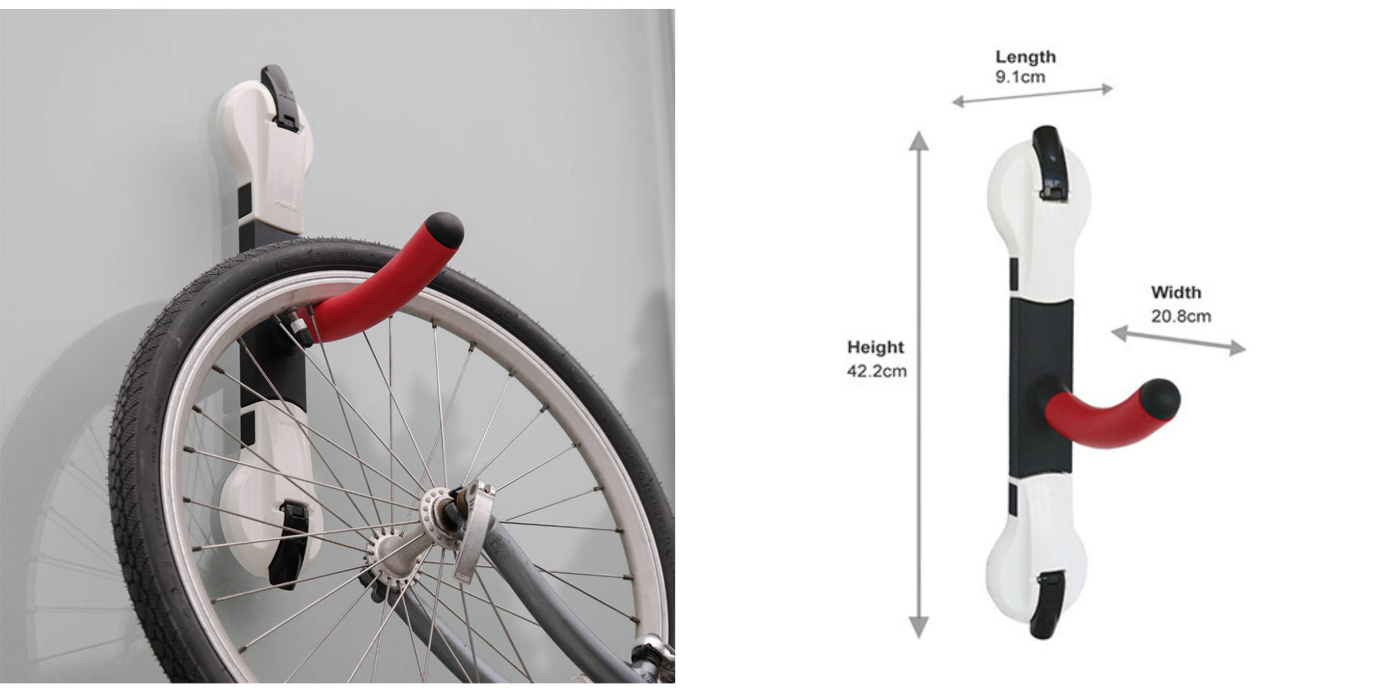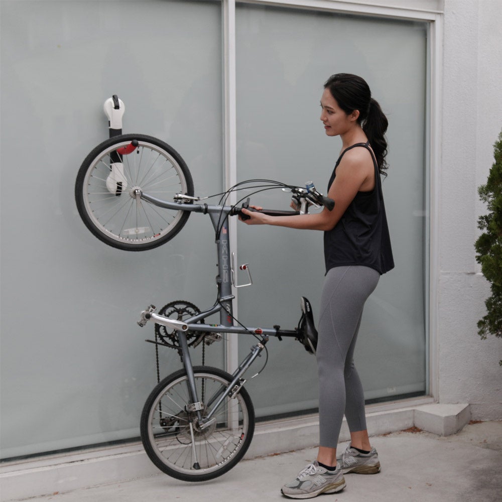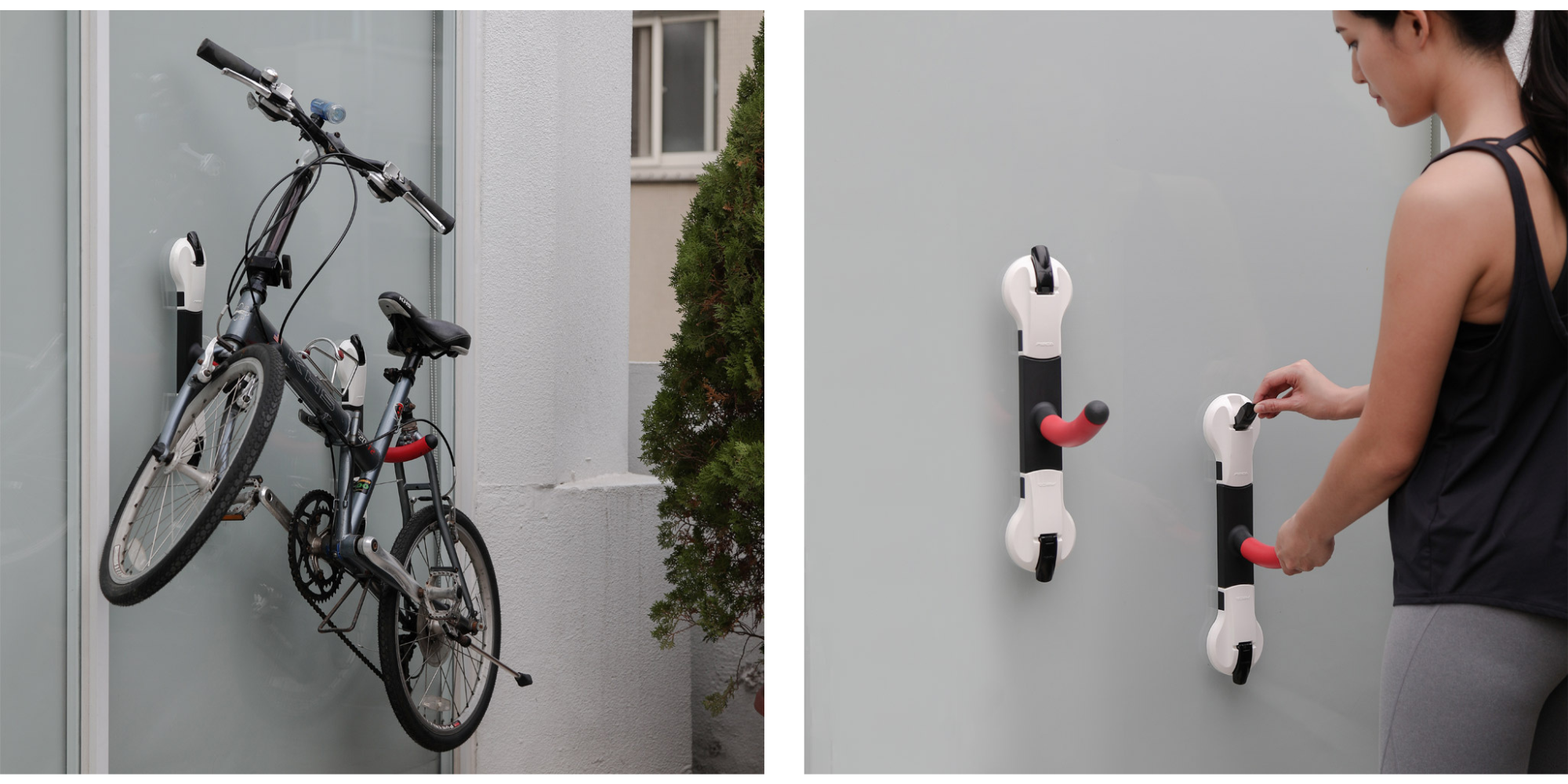 吸盤技術を用いることで、ねじ・くぎ不要で壁に穴を開けずに吸盤で設置。自転車を壁にかけることで、省スペースで室内に保管が可能。