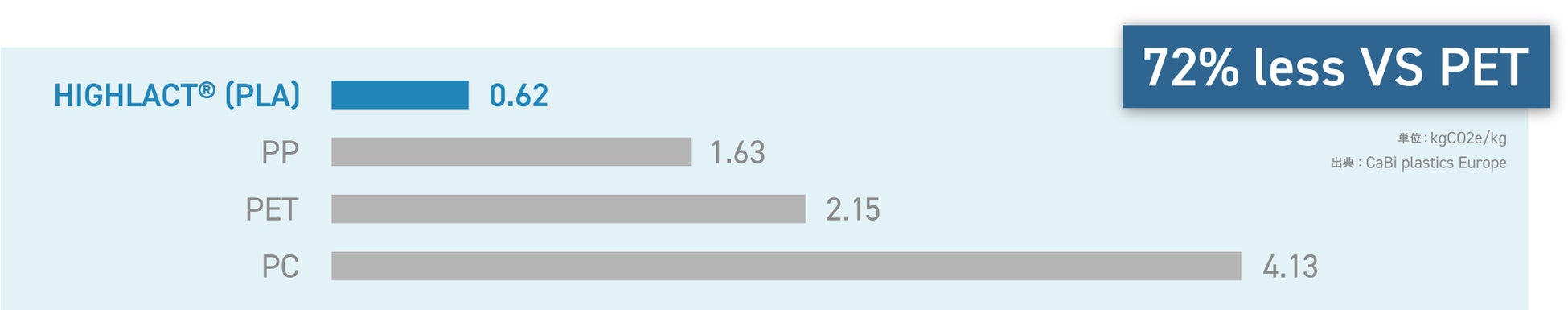 PLAは、石油由来の素材に比べ、製造時のCO2排出量が少ないことから、サステナブルな素材として注目されています。例えば、世界の繊維生産量の約6割を占めるポリエステルの原料であるPETに比べ、PLAのCO2排出量は72%少なくなります。これにより、ポリエステルからの置き換えが進むことで、CO2排出量の削減が期待できます。