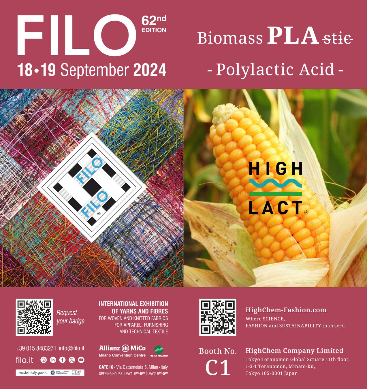 ハイケム株式会社(本社:東京都港区、代表取締役社長:高潮(たか うしお)、以下ハイケム)は、トウモロコシ由来のポリ乳酸(PLA)繊維「HIGHLACT®(ハイラクト®)」を、9月18日(水)・19日(木)に、イタリア・ミラノで開催される国際的な糸とテキスタイルの見本市『第62回 Filo(以下「フィロ」)』に出展いたします。
