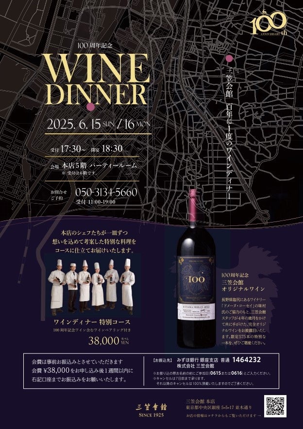 株式会社 三笠会館(東京都中央区銀座5-5-17 代表取締役社⻑ 谷辰哉)は、2025年に迎える創業100周年の記念として、完全オリジナル・ワイン『三笠会館 100周年記念ワイン』を限定575本生産しました。2025年6月15日(日)と16日(月)に開催される特別ディナーコース“100周年記念 WINE DINNER”でお披露目いたします。