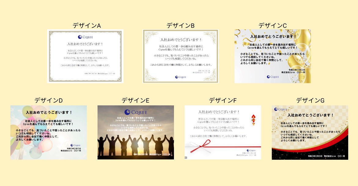 下記デザインA~デザインGまでの7つのデザインの中から幹事さまにお好きなデザインを選んでいただき、「メッセージ文面」「企業ロゴ」を入れていただくことが可能です。「入社式」の思い出の品として是非ご活用ください。