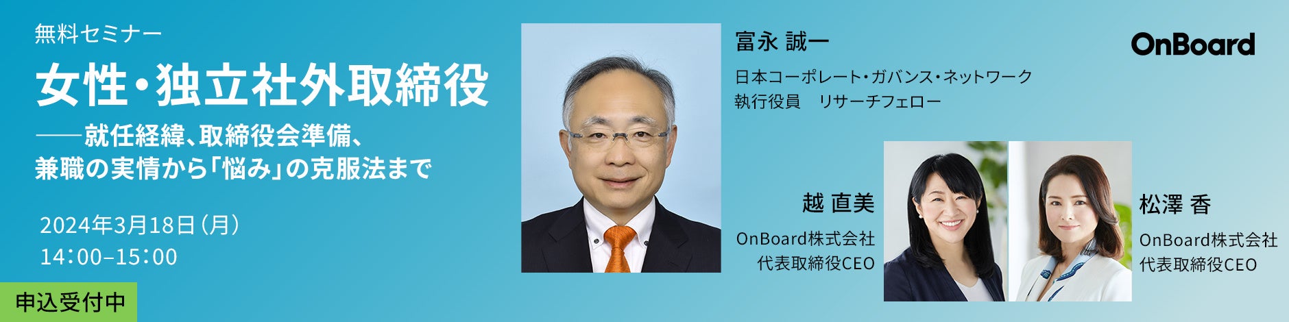 元大津市長で弁護士の越直美と弁護士の松澤香による、女性役員の育成・紹介に特化したOnBoard株式会社(以下、「OnBoard」といいます。)が2024年3月に無料セミナーを開催いたします。