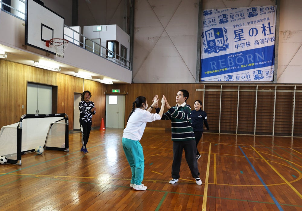 当日会場となった「星の杜中学校高等学校(栃木県宇都宮市)」の高校生の学生さんたちが、今回ボランティアとして参加してくれました。「日常において障がいのある子どもたちや小学生の子たちと触れ合う機会が少ないため、最初は緊張していた。」との声もありましたが、事前打合せやイベント準備から始まり、開催中は子ども達と一緒に走ったり、笑ったり、ハイタッチしたりと、たくさん盛り上げてくれました。「また機会があれば参加したい」「この経験を日常においても活かしていきたい」と話してくれました。