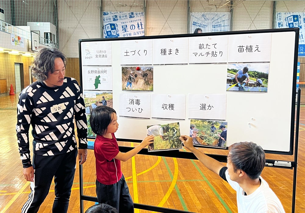 元サッカー日本代表「石川 直宏」さんが農場長を務める【NAO’s FARM】より、稲刈りや農業について詳しく教えていただきました。子ども達は真剣に耳を傾けながら、知っている知識や情報について手を挙げ、食についての新たな興味を持ち、積極的に参加している姿が印象的でした。身近な野菜や果物の見分け方も学び、当日会場に用意された栽培期間中に農薬を使用していないお米や野菜、果物を実際に手に取り、お買い物を楽しみました。