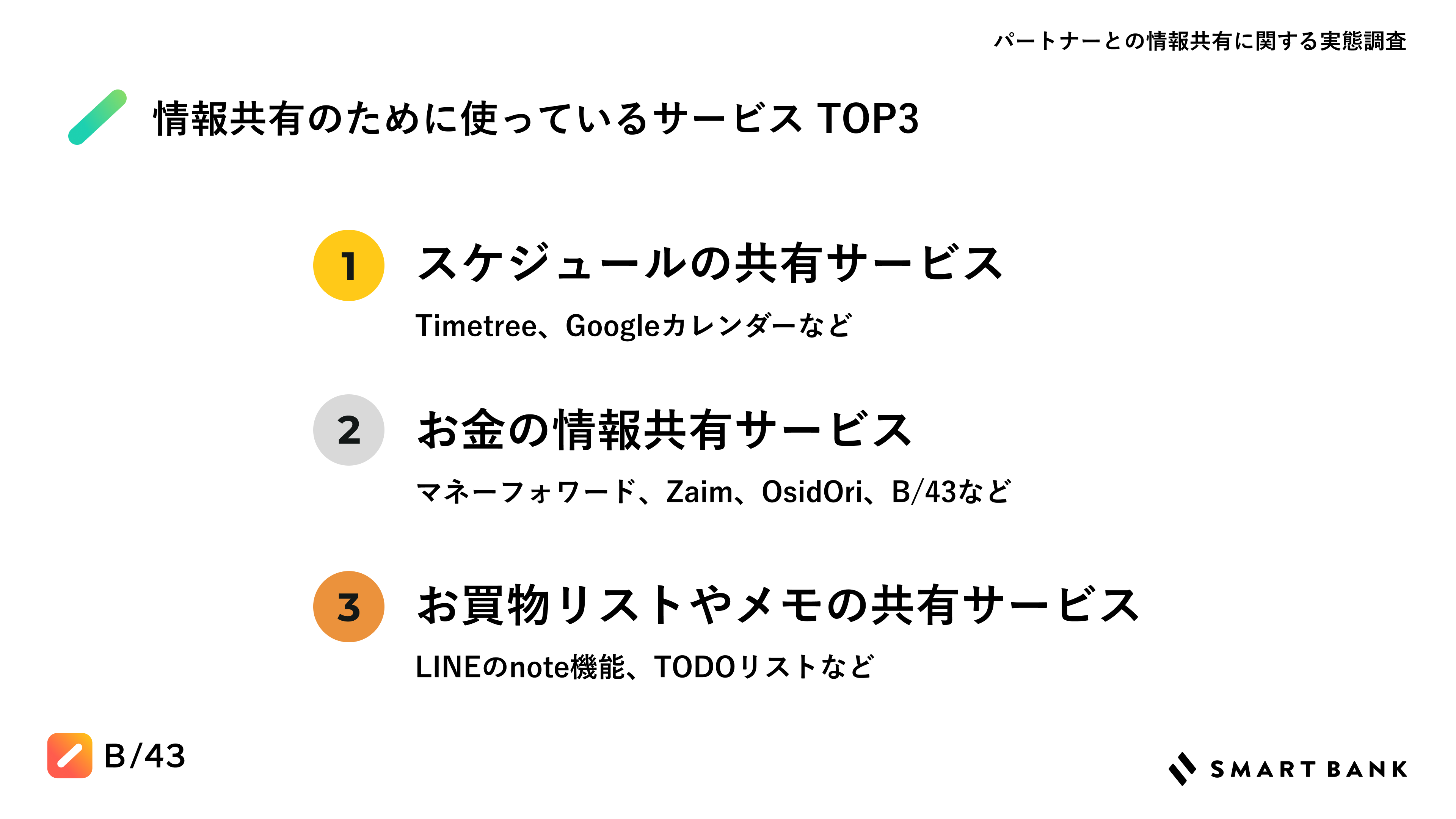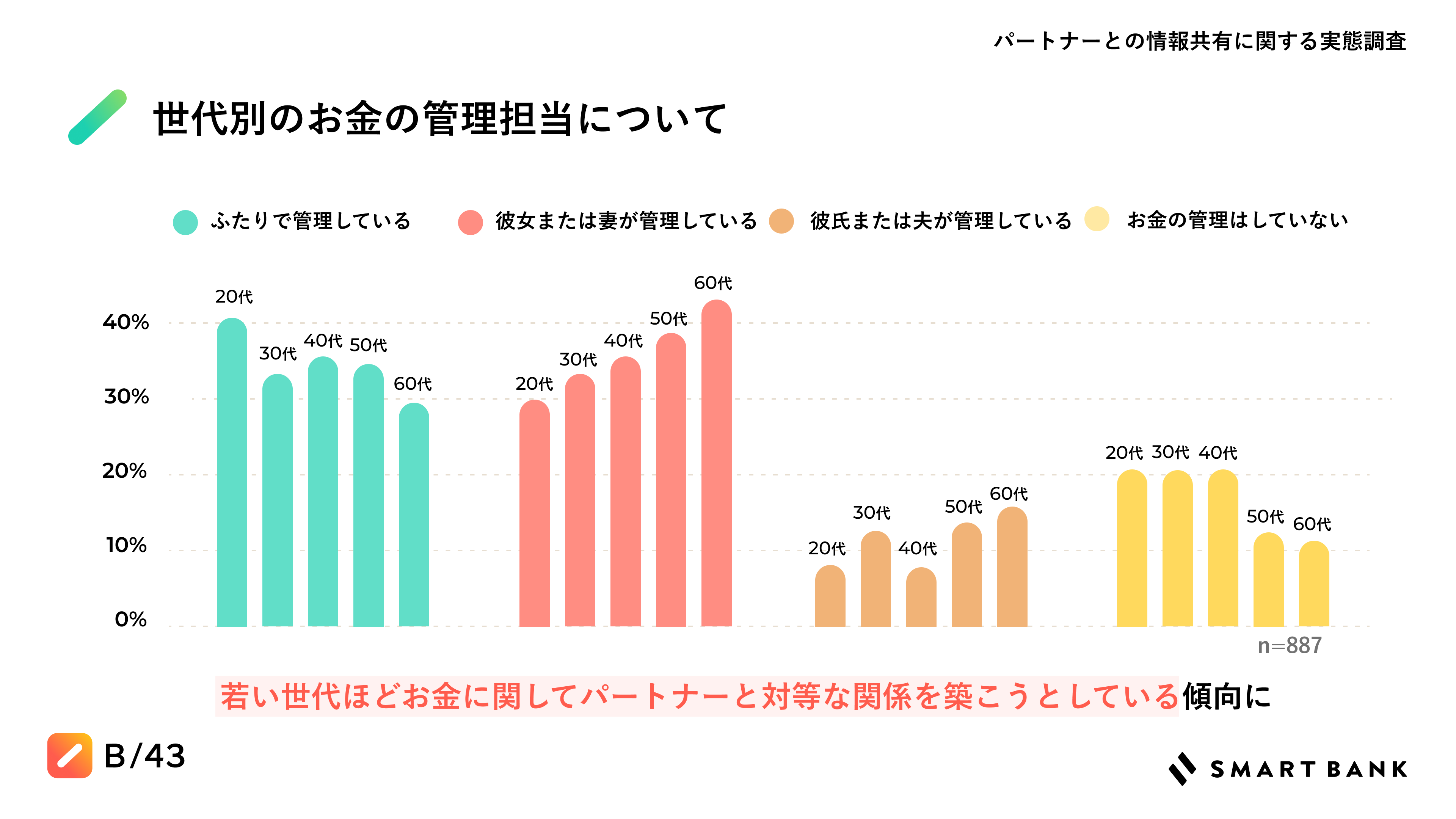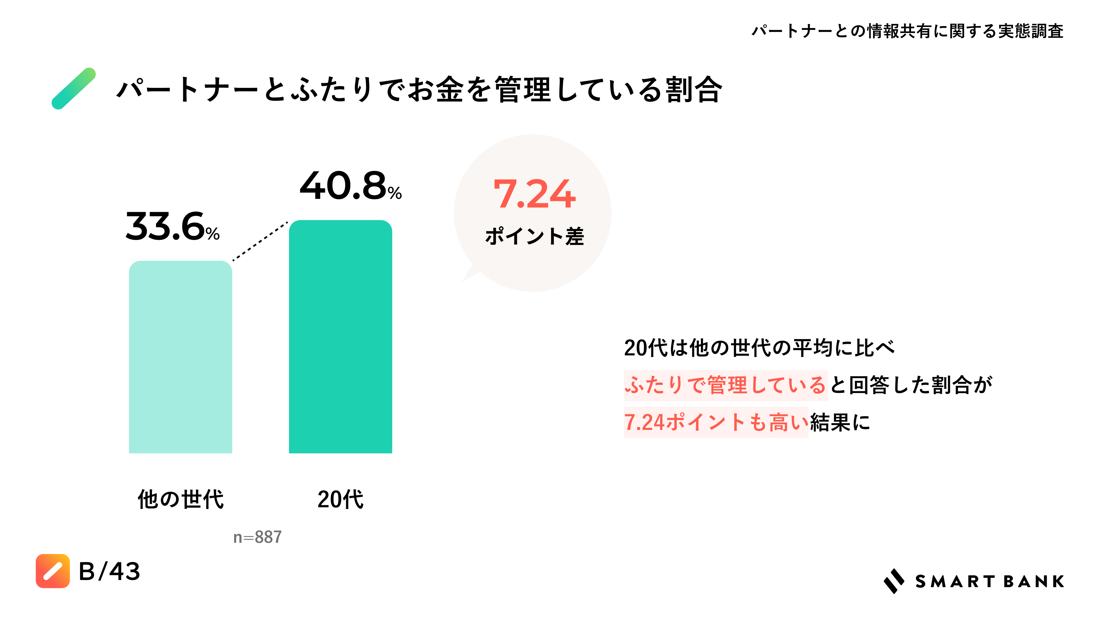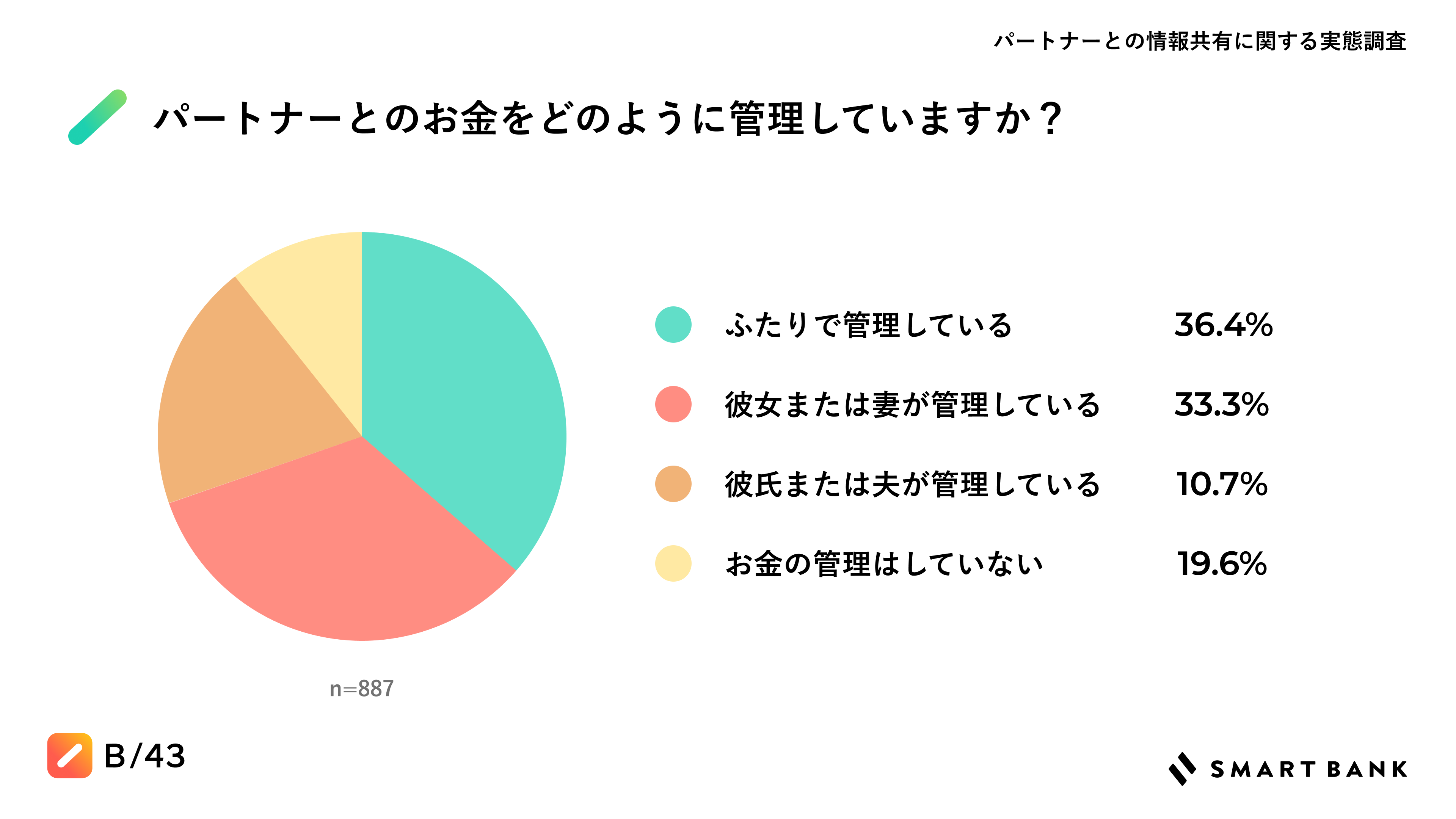 家計簿プリカ「B/43(ビーヨンサン)」を提供する株式会社スマートバンク(本社:東京都品川区、代表取締役:堀井 翔太、以下「当社」)は、20代〜60代の男女893名を対象に、パートナーとの情報共有に関する実態を調査いたしました。
