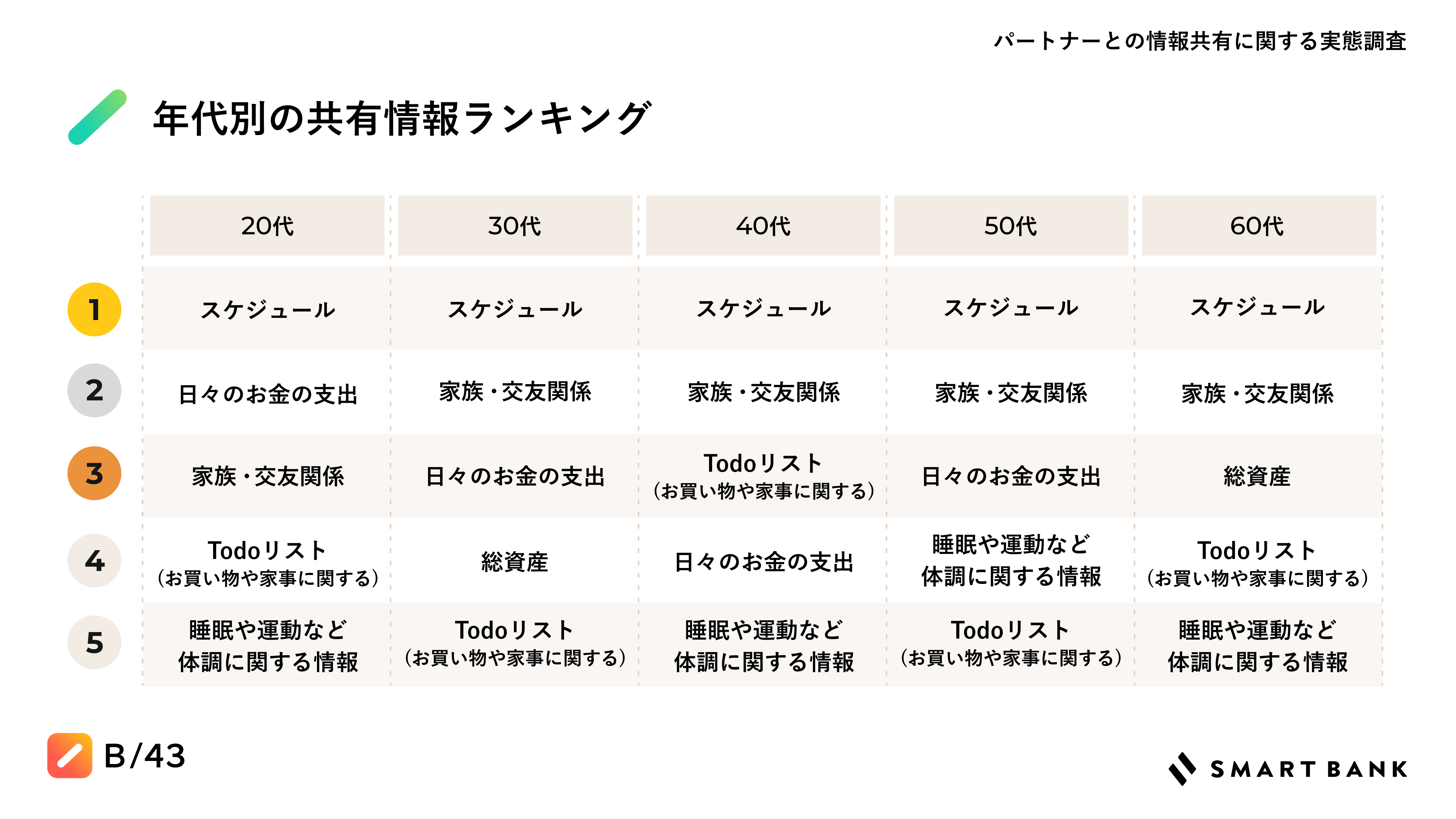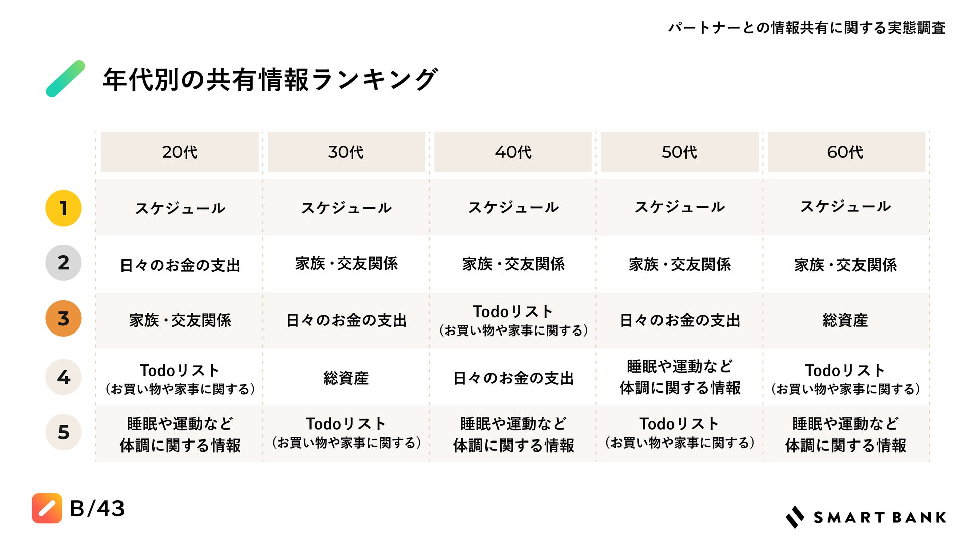 3. パートナーと良い関係であると回答した人が共有している情報を年代別にランキング化。全年代1位は「スケジュール」