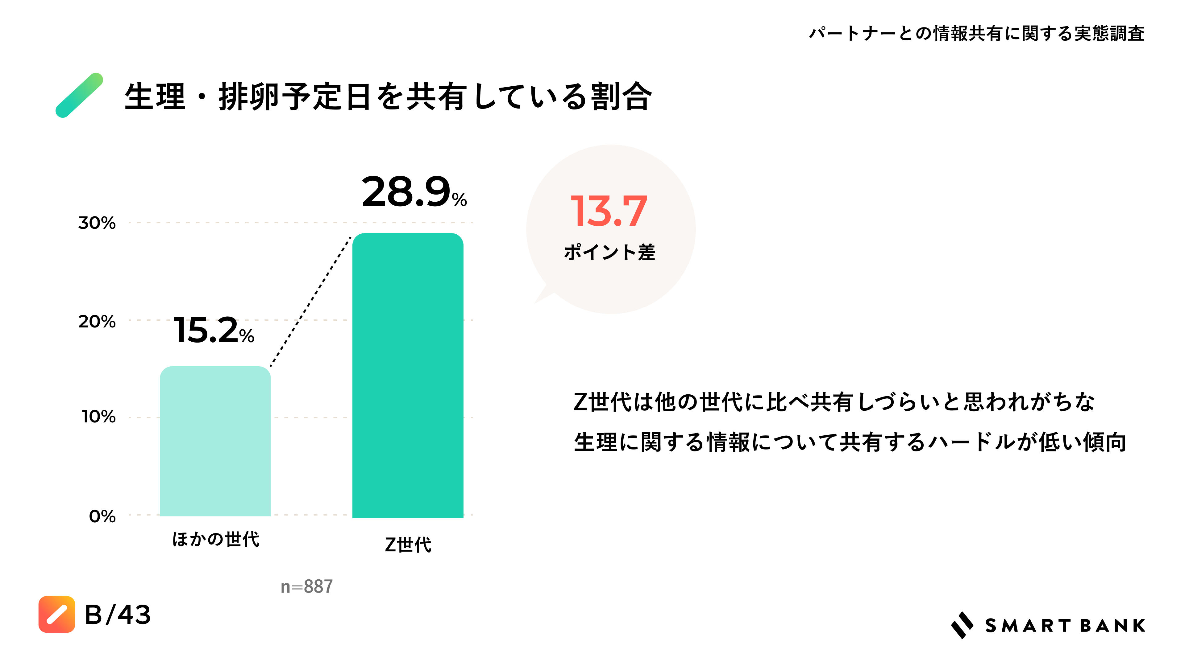 Z世代においては「生理・排卵予定日」を共有しているという回答が28.9%、そのほかの世代は15.2%。