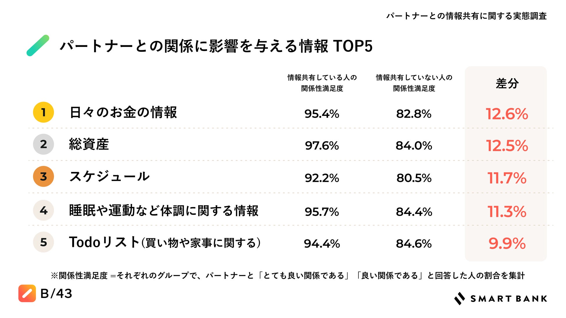 パートナーとの関係性について「とても良い関係である」「良い関係である」と回答した人と「あまり良い関係ではない」「全く良い関係ではない」と回答した人で、関係性に差分が表れた情報は、「日々のお金の支出」が差分12.6ポイントと最も大きく、「総資産」が12.5ポイント、「スケジュール共有」が11.7ポイントという結果となりました。