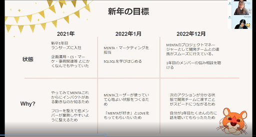 次に、今回のイベントに参加された理由を明確にするため「新年の目標」を考えるワークショップを実施いたしました。仕事やスキルだけでなく、健康に関する目標を挙げた方もいらっしゃり、参加者の個性がわかりました。