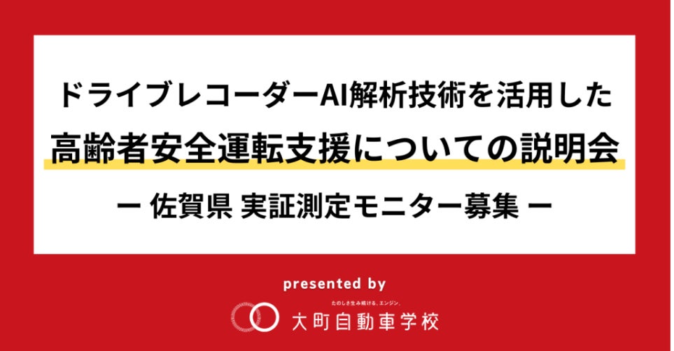 佐賀県における高齢者の安全運転を支援するため、大町自動車学校グループ 鍋島校は、2023年1月30日(火)に「ドライブレコーダーAI解析技術を活用した高齢者 安全運転支援についての説明会」を開催し、交通事故削減に向けた実証へご協力いただけるモニターを募集します。
