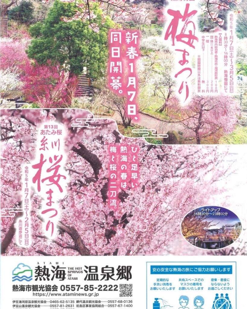 配布はこれまで⾏われていましたが、2023年1⽉10〜再開し3⽉31⽇まで延⻑。全国旅⾏⽀援期間中、熱海市内では「熱海梅園梅まつり:1月7日~3月5日」と「あたみ桜糸川桜祭り:1月7日~2月5日」が開催されます。