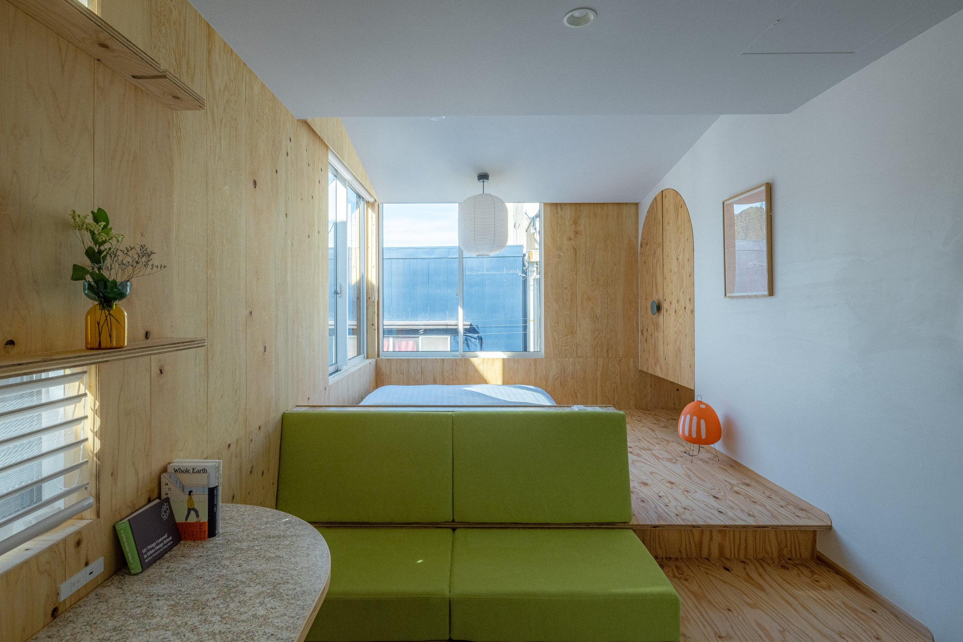「前回のリノベーションモデルと同時に計画を進めていた新築ショップハウスのプロトタイプが遂に立ち上がった。この新築モデルはリノベーションモデルと同様に、グラウンドレベルは街に開く商店、2階を宿泊施設という構成である。建築的には正方形モジュール(6.34m×6.34mの計40㎡)を縦に積み上げたシンプルな形状を取る事で本敷地のみならず、商店街の空き地をにそのまま、もしくはマイナーチェンジで建築が可能となるように計画している。今回のプロトタイプモデルでは、1階のテナント区画は平面上4つのコーナーと接道面に開口を設け、どのようなテナントが入っても、中と外がシームレスにつながる計画としている。2階は18㎡の客室を2部屋設け、リノベーションモデルと同様に室内に高低差をつくり出しコンパクトでありつつも『すごす』と『ねる』を使い分ける事のできるミニマルな宿泊空間を目指した。」