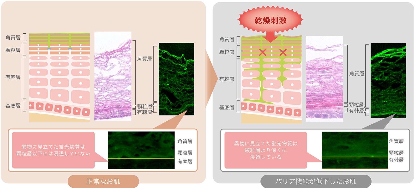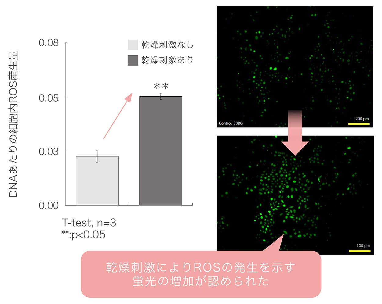 エアコンの使用などによる湿度の変化は、乾燥刺激となり一時的にROSの産生を促します。この一時的なROSの発生は遺伝子発現量の低下を介し、お肌のバリア機能で重要な役割を果たすタイトジャンクション構造の形成低下を引き起こします。タイトジャンクション構造の形成が低下したお肌の内部ではさらなる乾燥によってROSが発生しやすくなり、乾燥肌トラブルが慢性化します。そのためROSの産生を抑制することが、慢性的な肌の乾燥の改善には重要となると考えられました。