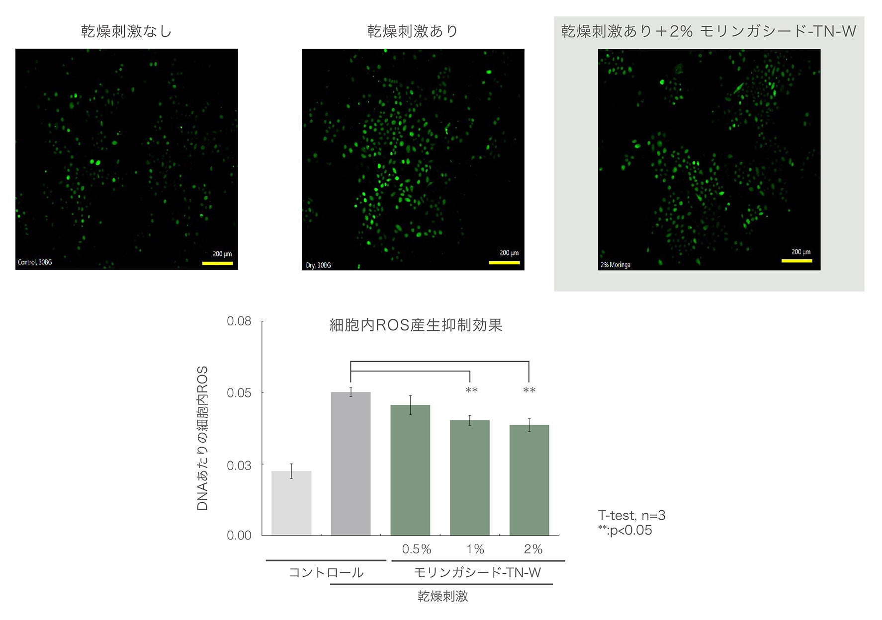 乾燥刺激によるROSの発生と皮膚バリア機能との関係性を明らかにし、肌内部での持続的なROSの発生を抑制する効果を「モリンガシード-TN-W」で実証。