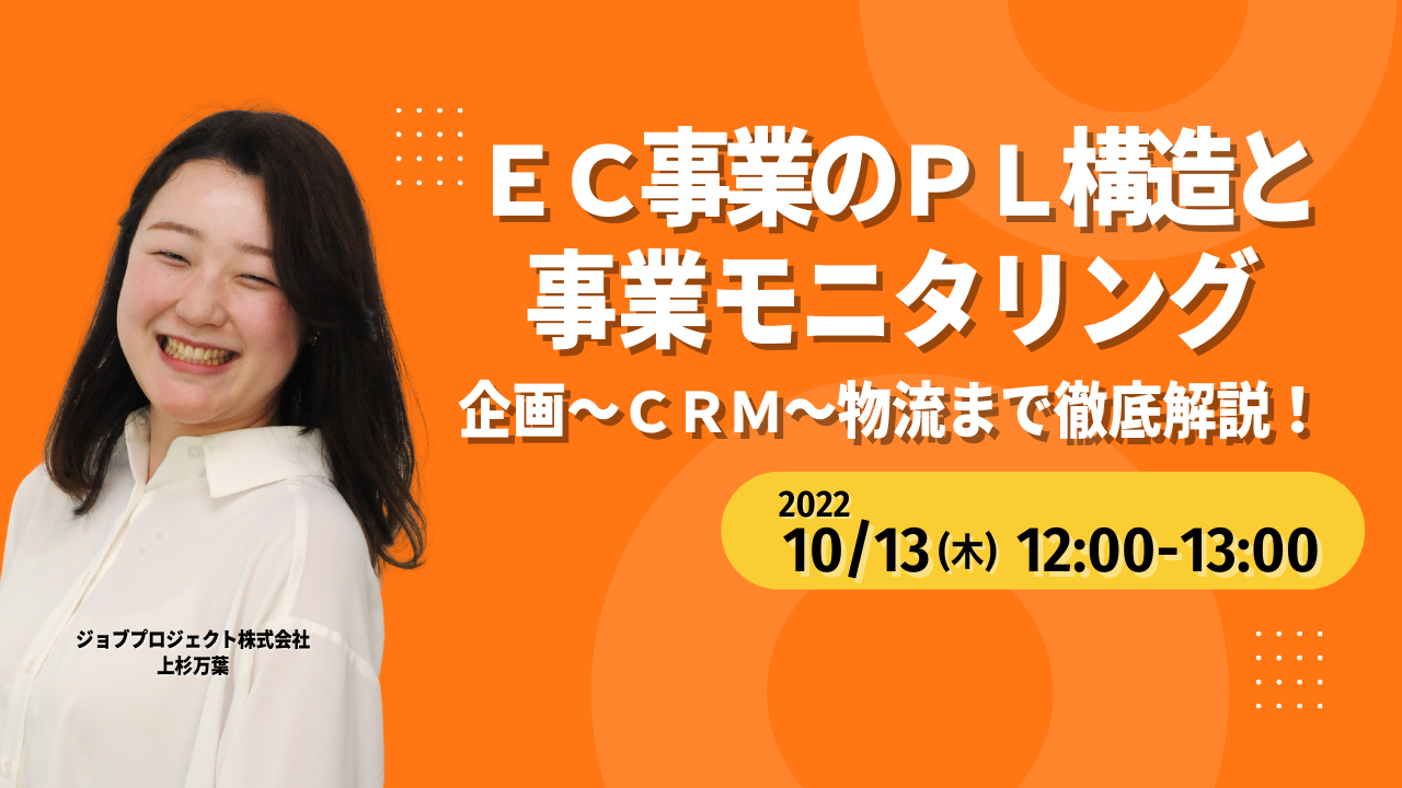 ハタラクをつくる、楽にする、楽しむソリューションを提供するジョブプロジェクト株式会社(本社:東京都新宿区、代表取締役:鈴木 貴大 https://job-project.com/ 以下、ジョブプロ)は、この度、「EC事業のPL構造と事業モニタリング」と題し、EC事業の一般的なPL構造から、事業を伸ばしていく際のKPI設計まで事例をもとに解説するセミナーを2022年10月13日(木)12:00~開催いたします。