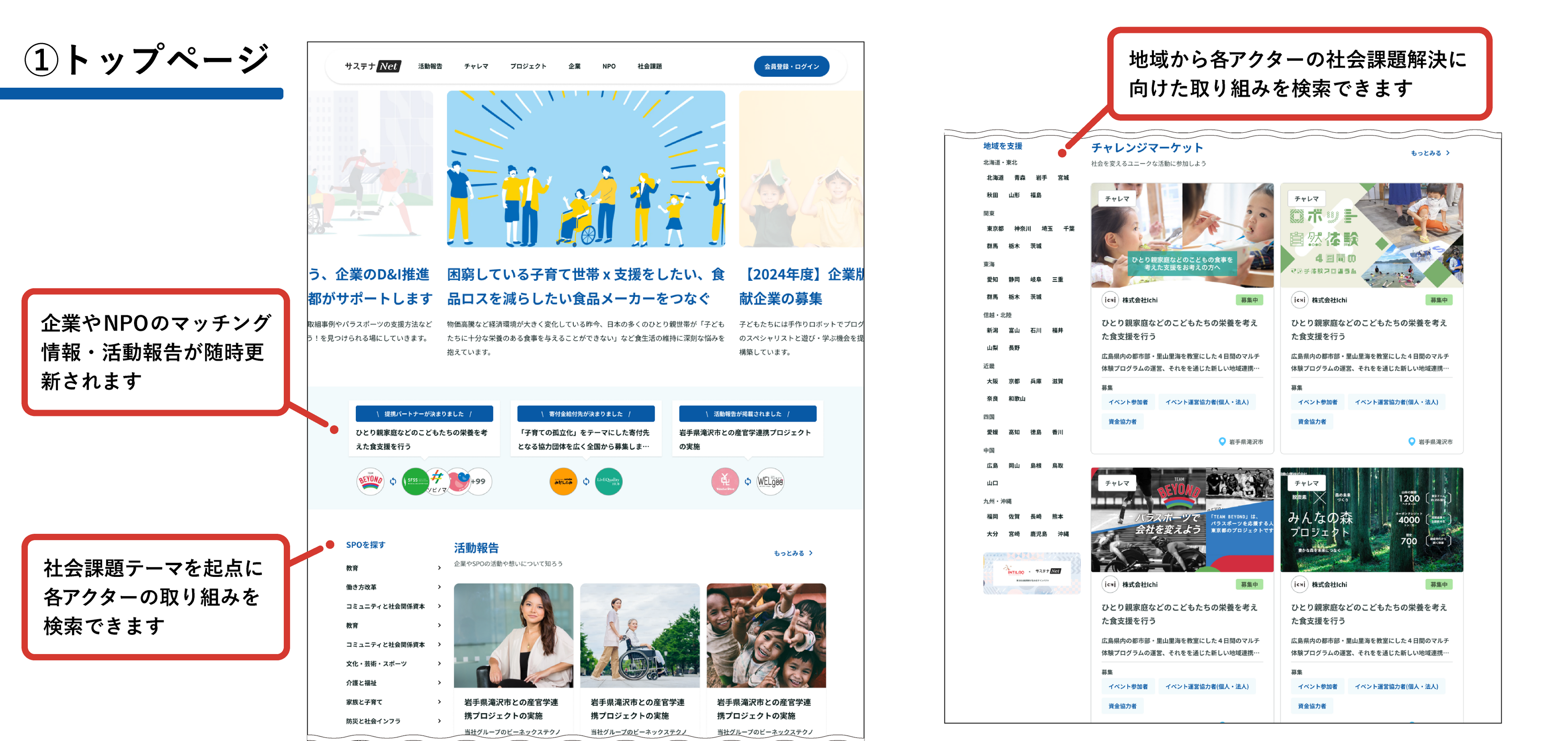 地域や社会課題のテーマから、社会課題解決の取り組みを検索できるようになりました。企業やNPOなどのマッチング情報が随時更新され、最新の活動報告も一覧化されるなど、各アクターの取り組み状況や、「サステナNet」を通じて生まれた共助共創の活動が一目でわかるようになりました。