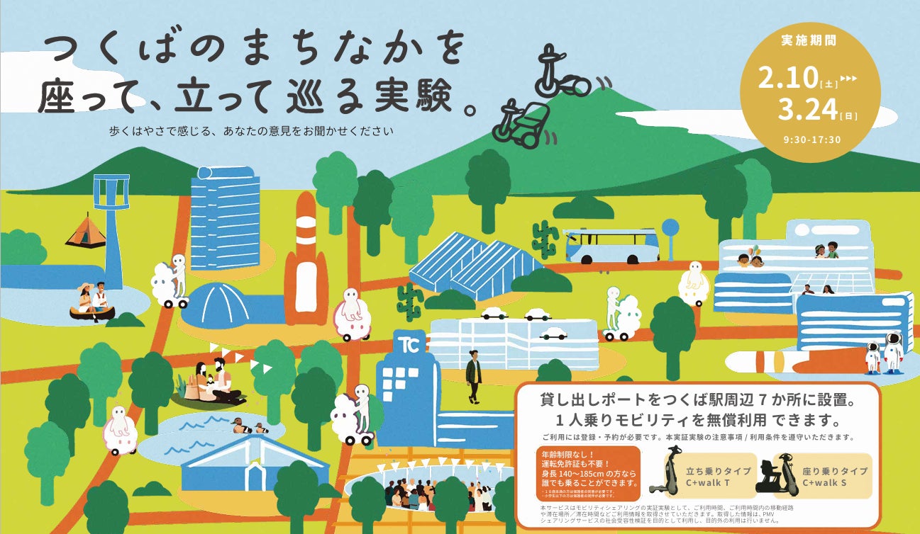 貸出ポートをつくば駅周辺7ヶ所に設置、一人乗りモビリティを無償でご利用できます。事前予約制(当日受付も可)で2024年2月1日より予約受付中。