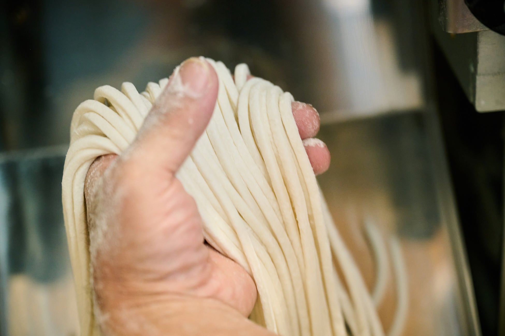 私たちの米粉うどんは、元はプラントベース・グルテンフリーのうどんレストラン「by age 18」の製麺部で生まれたものです。