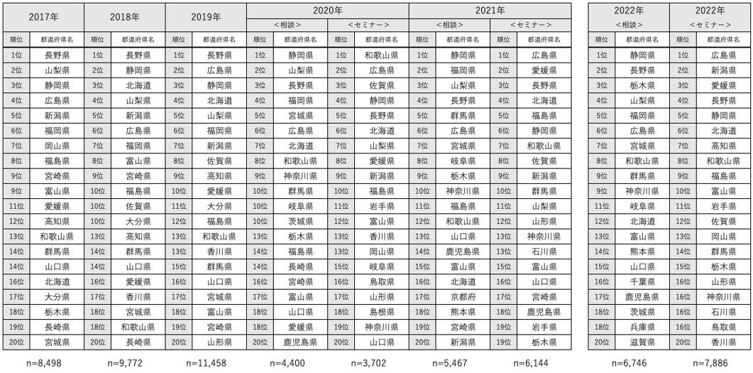 窓口相談者では3年連続、静岡県が1位に、セミナー参加者では2年連続、広島県が1位に。