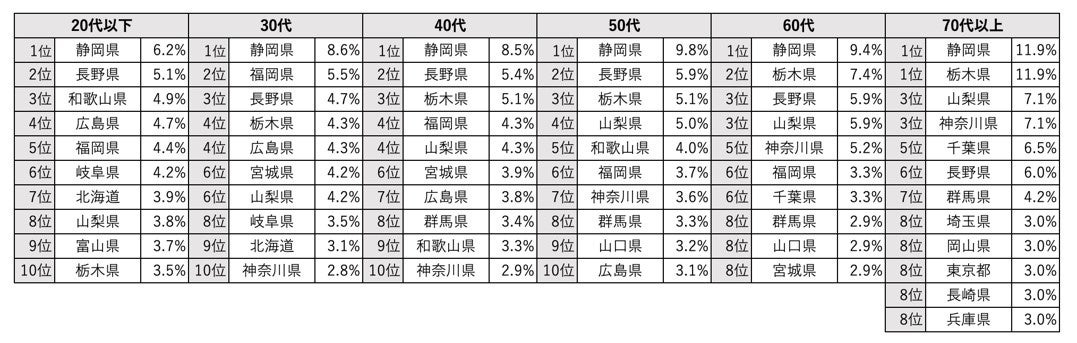 1位:静岡県、 2位:長野県、 3位:栃木県