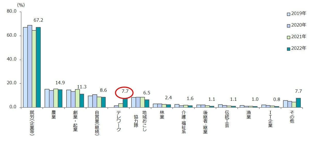 2022年も地方移住への追い風がコロナ禍で引き続き吹いており、センターの相談窓口の体制を強化し、首都圏の移住希望者の動向を注視し、うまく捉えた都道府県が相談件数を伸ばした。2022年のアンケート結果の特徴として、①移住希望地では、対2021年比較で「地方都市」を希望する人(64.9%→73.6%)と「農村」を希望する人(19.7%→23.8%)が増え、「その他(希望地未定)」が減っている(11.4%→3.8%)。②移住時期では「今すぐ(1年未満)」が増えた(31.0%→36.1%)。③相談者の年齢は、2021年に引き続き40代以下が全体の7割程度を占める。①②から、移住希望地が明確な本気度の高い相談が増えている傾向、③から現役世代や子育て世代が中心であることがわかる。④就労形態では「テレワーク希望」が増えており(3.2%→7.7%)、コロナ禍での世相を反映しているが、この傾向については今後も注視が必要であろう。
