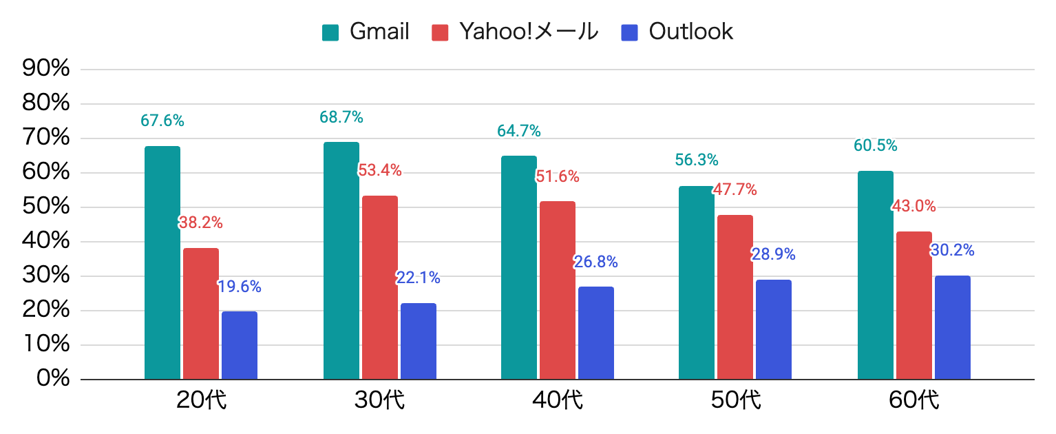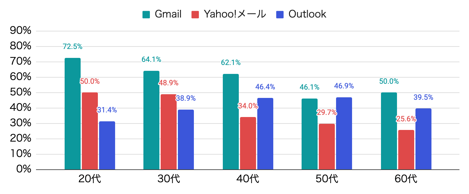 さらに、上位3つのメールサービスの利用状況を年代別に見ると、以下のような結果となりました。
