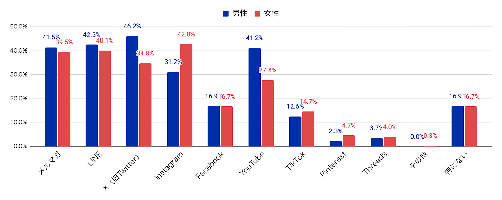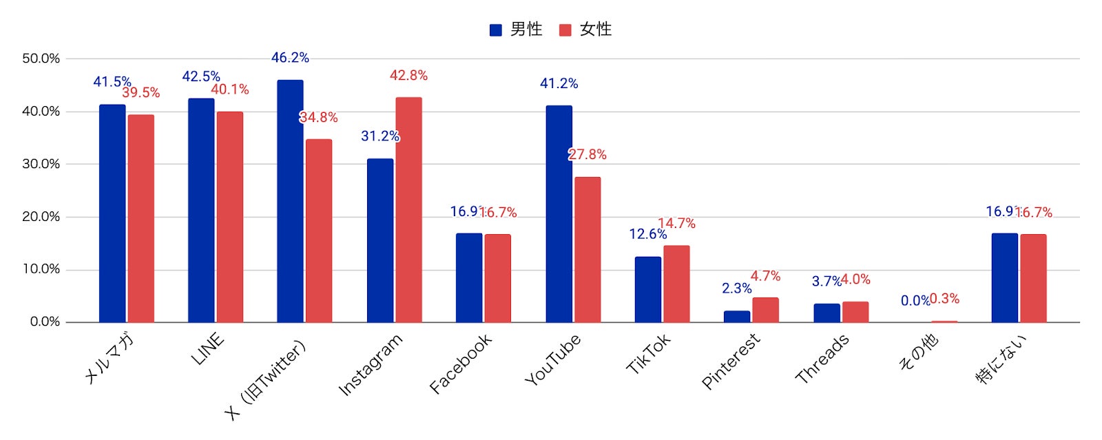 さらに男女別に見ると、メルマガやLINEは大きな差が見られなかった一方で、XやYouTubeは男性が比較的多く、Instagramは女性の方が多く活用している結果となりました。SNSを使い分けたり、複数チャネルを併用することで、より的確に自社のターゲット層にアプローチすることができるでしょう。