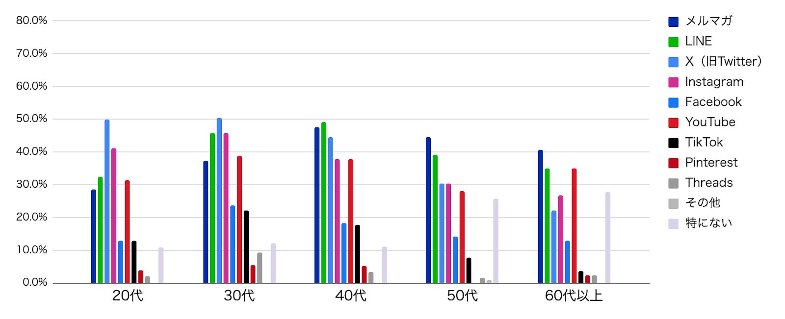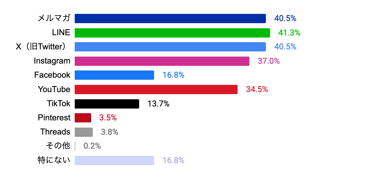 20代〜30代はX(旧Twitter)での情報収集が最も多く、40代はLINE、50〜60代はメルマガが最も多い結果となりました。