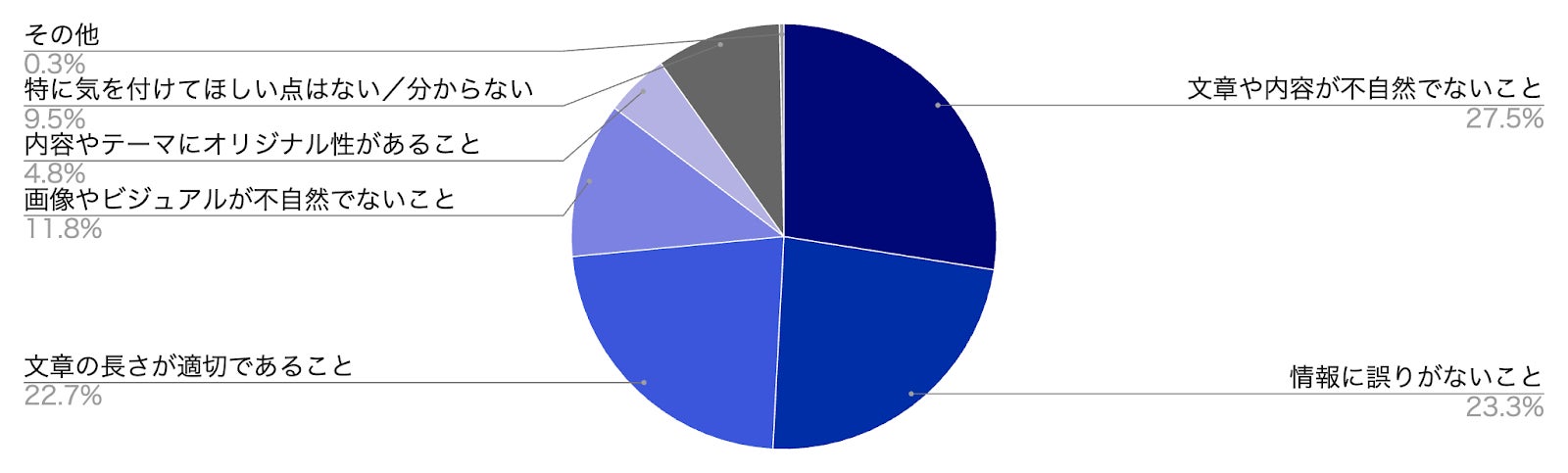 1位は「文章や内容が不自然でないこと」(27.5%)、2位は「情報に誤りがないこと」(23.3%)、3位は「文章の長さが適切であること」(22.7%)でした。