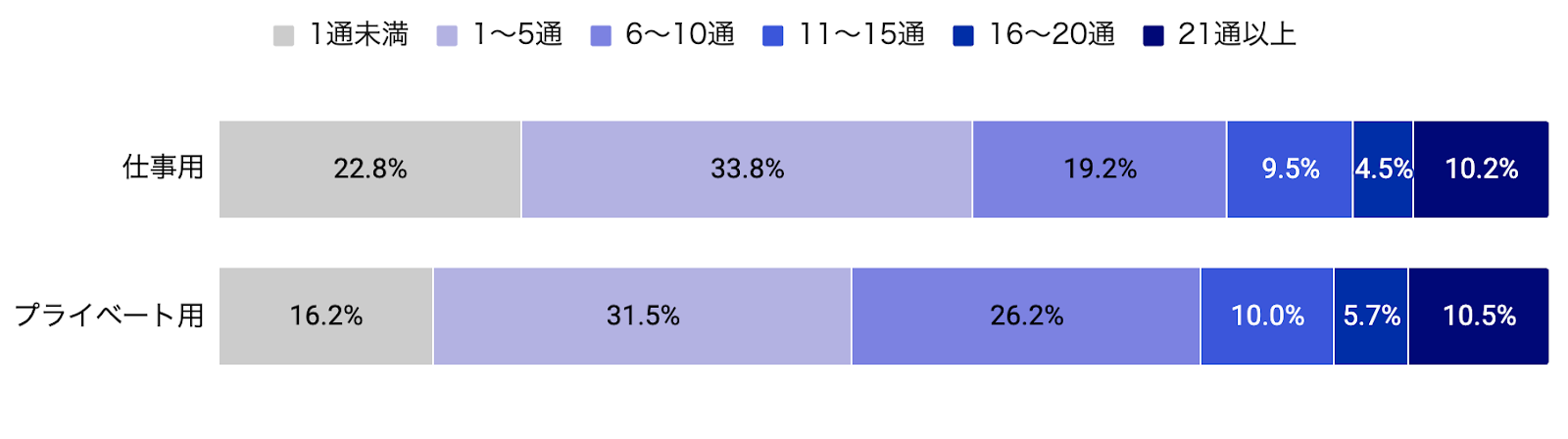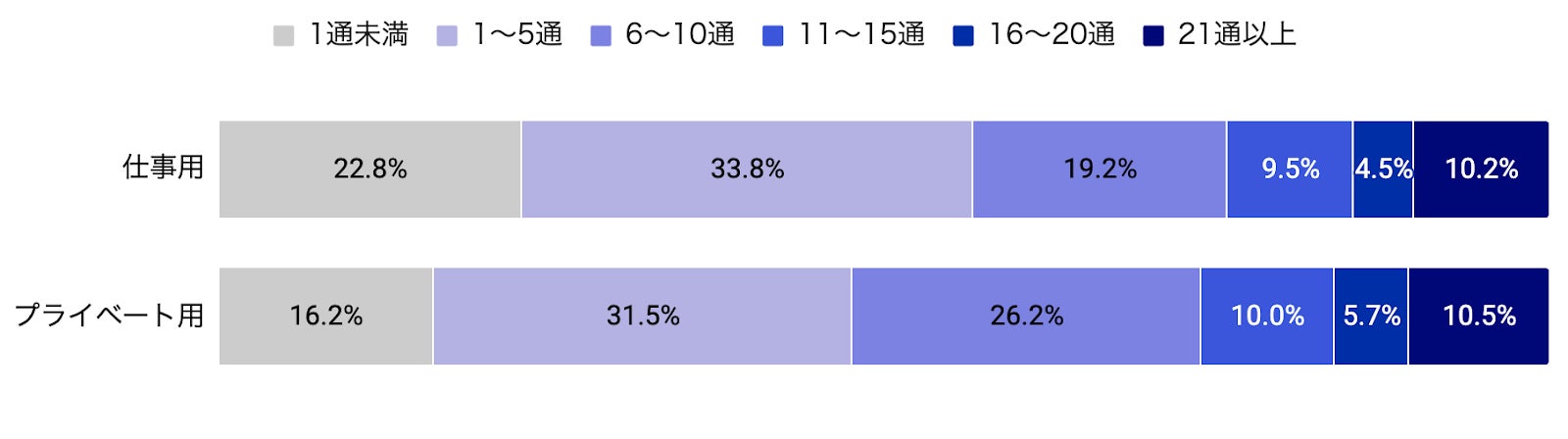 仕事用・プライベート用共に、1位は「1〜5通」となり、2位は仕事用では「1通未満」、プライベート用では「6〜10通」となりました。