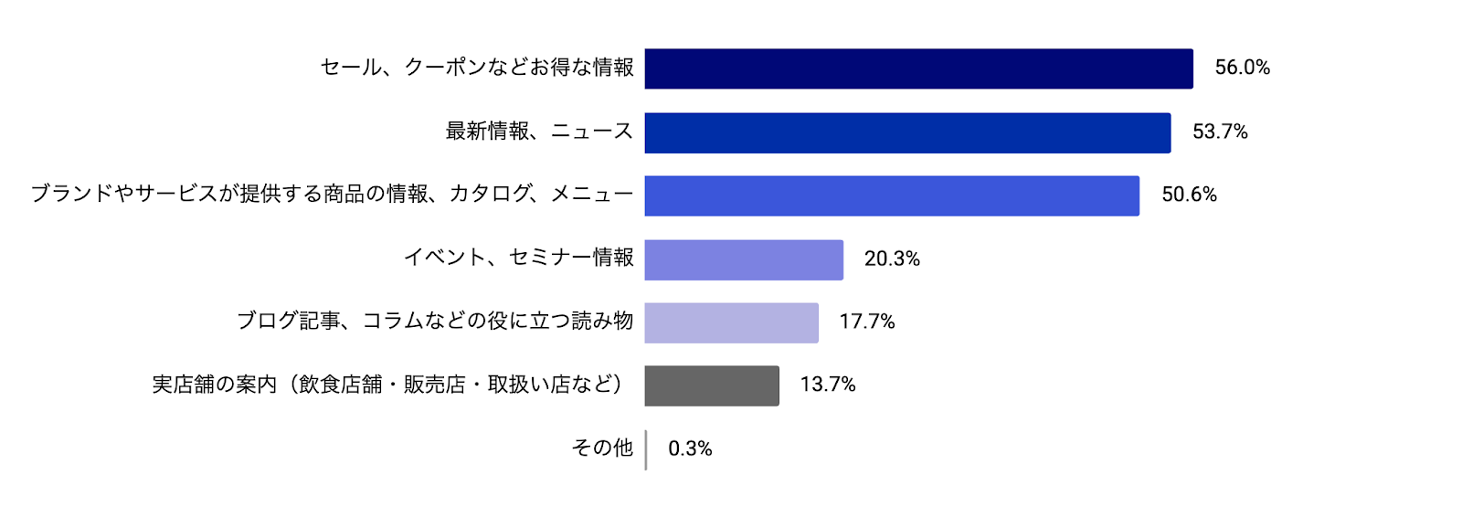 1位は「セール、クーポンなどお得な情報」で56.0%、2位は「最新情報、ニュース」で53.7%、3位は「ブランドやサービスが提供する商品の情報、カタログ、メニュー」で50.6%となりました。前回と比較すると、1位と2位が入れ替わっています。