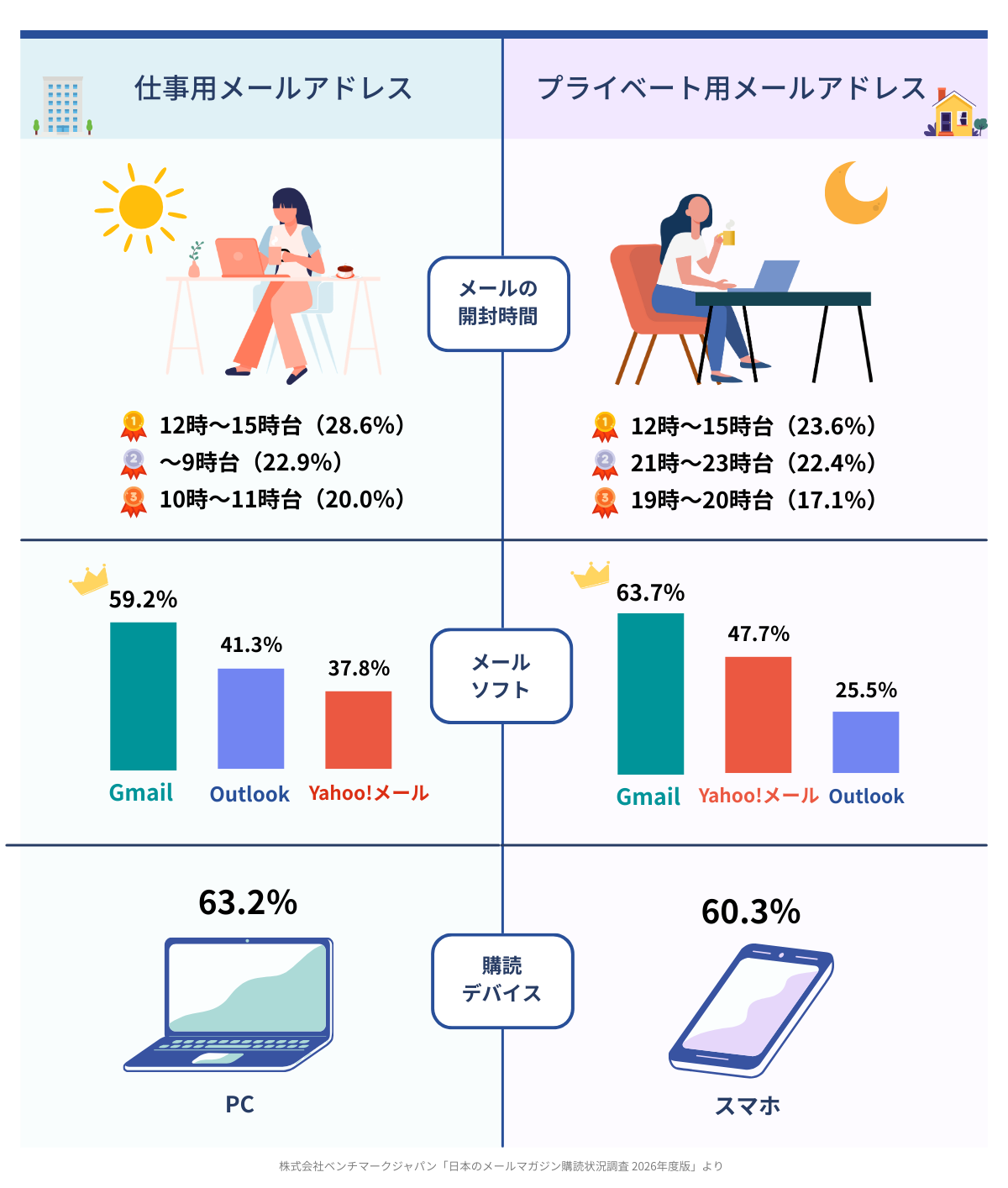 株式会社ベンチマークジャパンでは、2021年から「メールマガジンが日本のインターネットユーザーにどのように読まれているのか?」について、仕事用メールアドレス、プライベート用メールアドレスそれぞれにおける調査を行っています。今回の2026年度調査では、AIが作成したメルマガについての設問を新たに追加しています。