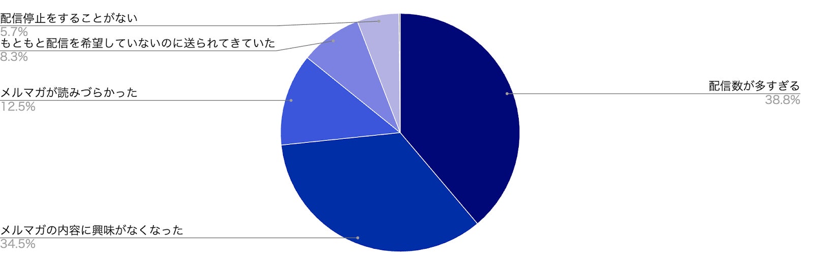 「配信数が多すぎる(38.8%)」と「メルマガの内容に興味がなくなった(34.5%)」との2つが全体の7割以上を占める結果となりました。