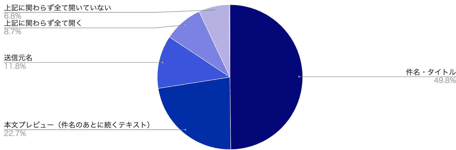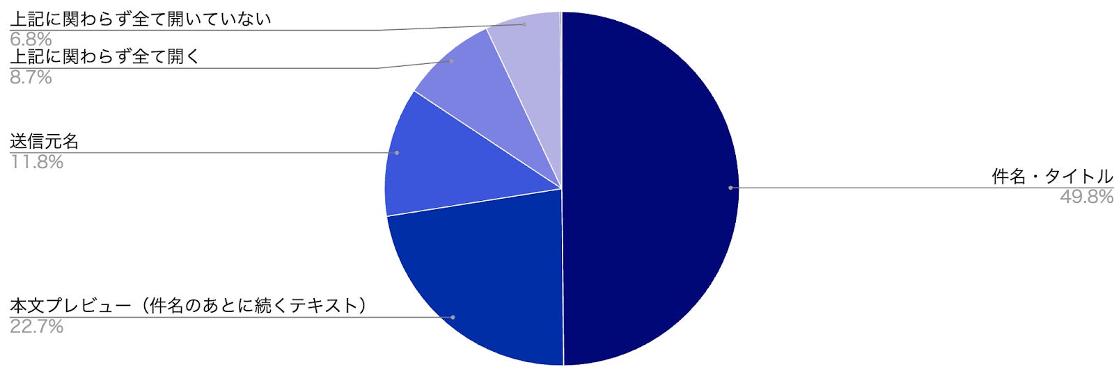 1位は「件名・タイトル」で49.8%(前回比-1.7ポイント)、2位は「本文プレビュー」で22.7%(前回比+2.0ポイント)、3位は「送信元名」で11.8%(前回比-8.0ポイント)でした。