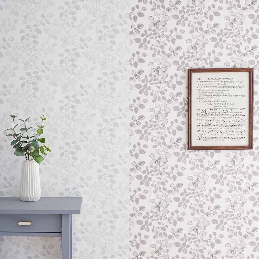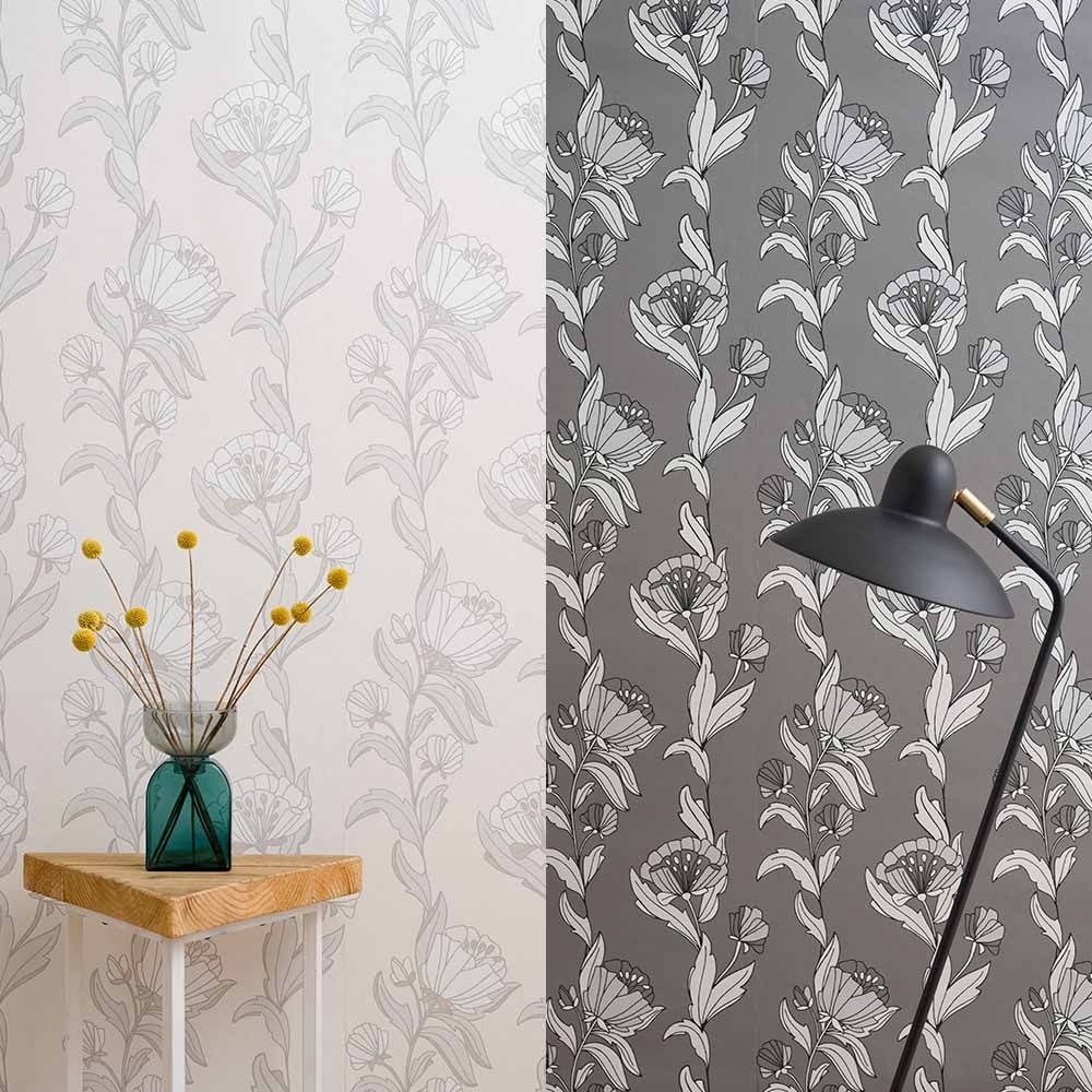 くすみカラーのベースに、北欧らしいモノトーンで構成されたシンプルなフラワーストライプ。和紙のようなテクスチャが入ったナチュラルな質感。ホワイトとグレーの2色展開。