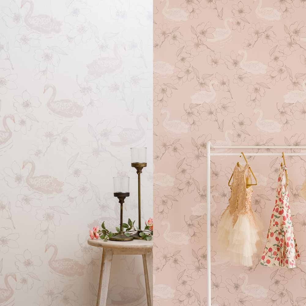 テクスチャのないフラットなベースに、湖を泳ぐ白鳥と線画で繊細に描かれたアルストロメリアの花の組み合わせ。白鳥と花という可愛らしくフェミニンな柄ながら、抑えたカラーで上品なデザイン。ホワイトとピンクの2色展開。