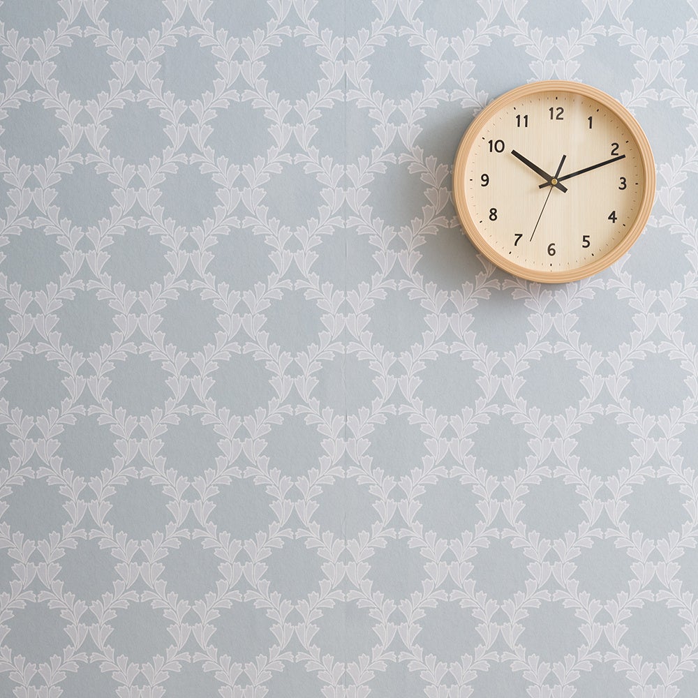 くみすライトブルーグレーベースに、ホワイトの縁取りの蔦の葉柄が幾何学模様のように並んだダマスク柄。