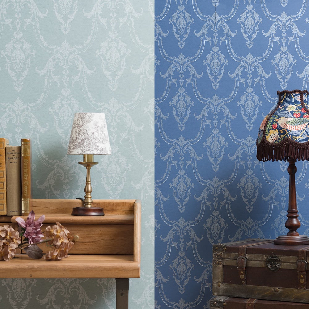 伝統柄コレクションらしい、典型的なヨーロピアンダマスク柄。塗り壁調のようなテクスチャが全体に入っており、ダマスク模様がシルバーカラーでプリントされたシンプルながら高級感あるデザイン。