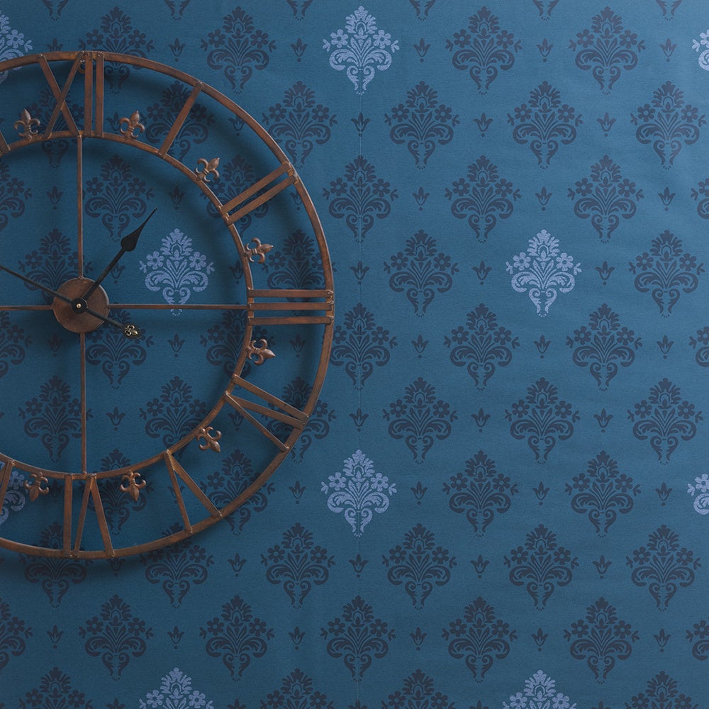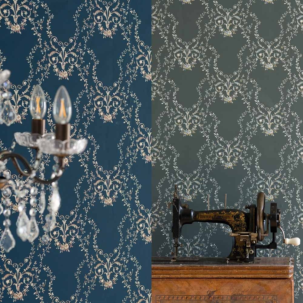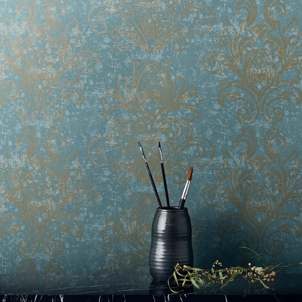 グリーンがかったくすみブルーベースに、ゴールドのラインだけのダマスク模様。アラベスク文様に近く、どこかエキゾチックな雰囲気。 全体にヴィンテージな塗壁調のようなテクスチャがあり、ゴージャスになりすぎない計算されたデザイン。